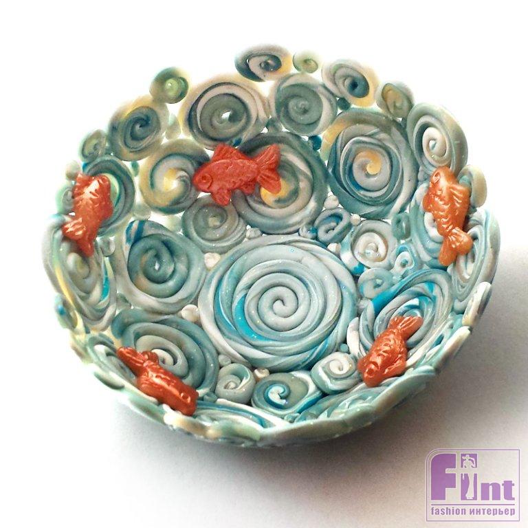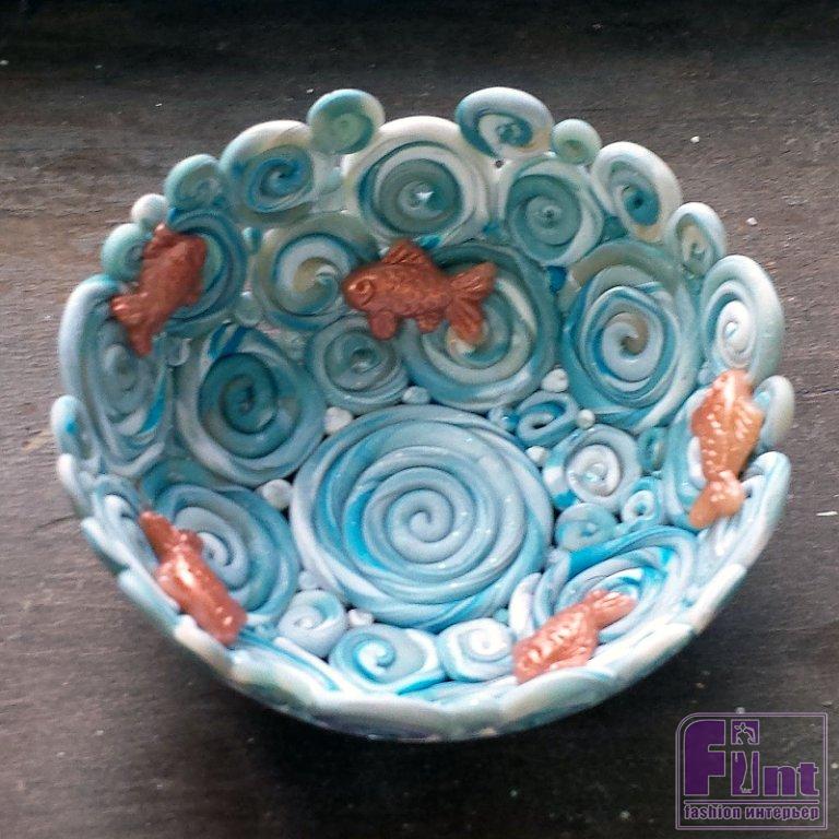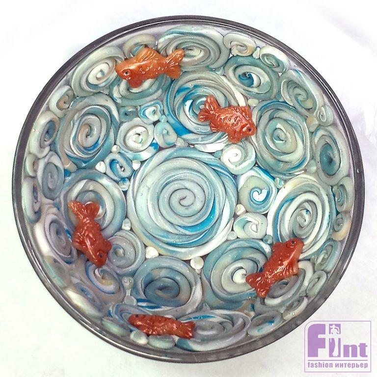 Разнообразная посуда, сделанная своими руками, обладает особым очарованием, несмотря на то, что по своим формам и качеству обработки такие изделия отличаются от фабричной посуды. Но в этом несовершенстве посуды, сделанной своими руками, и заключается её прелесть и уникальность. Сегодня мы расскажем, как сделать из полимерной глины очаровательную чашу с золотыми рыбками, словно плавающими в прозрачной воде волшебного пруда.