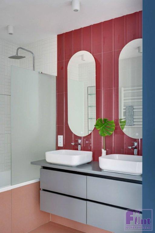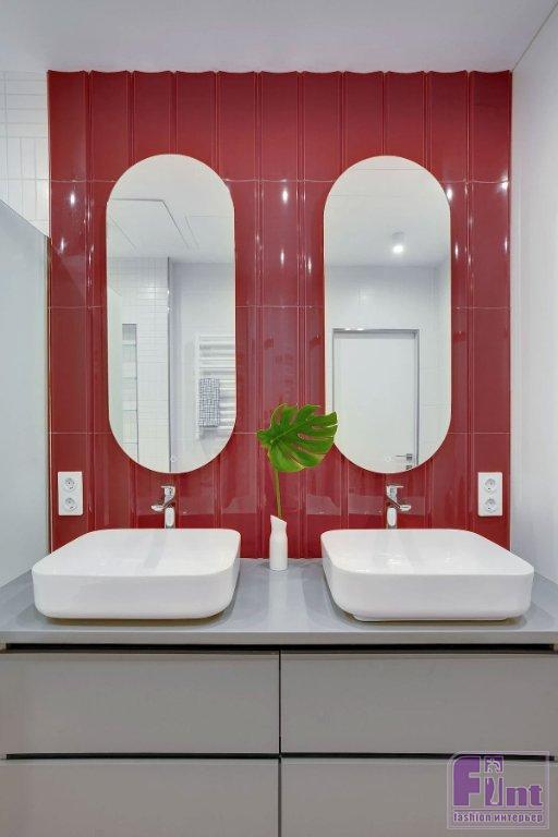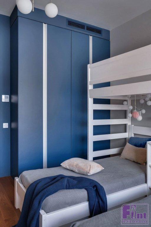 Для стен выбрали краску. Семья была открыта к ярким цветам. И Ксения приняла это во внимание. В интерьере много успокаивающего синего цвета, появляется благородный бордовый. Причём эти цвета проходят по всей квартире: синяя стена в столовой зоне в гостиной, синяя стена в детской, синий потолок в прихожей, бордовая стена в изголовье кровати в спальне родителей. Оба цвета объединяются в геометрическую покраску стены за телевизором. Эти же оттенки активно использовали и в мебели (например, верхние шкафы кухни, шкаф в детской). Бордовая плитка выложена в зоне раковин в мастер-ванной, а часть стен окрашена в синий. Конечно, для глубоких цветов нужен базовый фон, на котором они бы хорошо смотрелись. Таким стал светлый серый оттенок краски. Для пола в жилых комнатах выбрали инженерную доску насыщенного оттенка дуба, который отлично оттеняет глубокие синий и бордовый.
