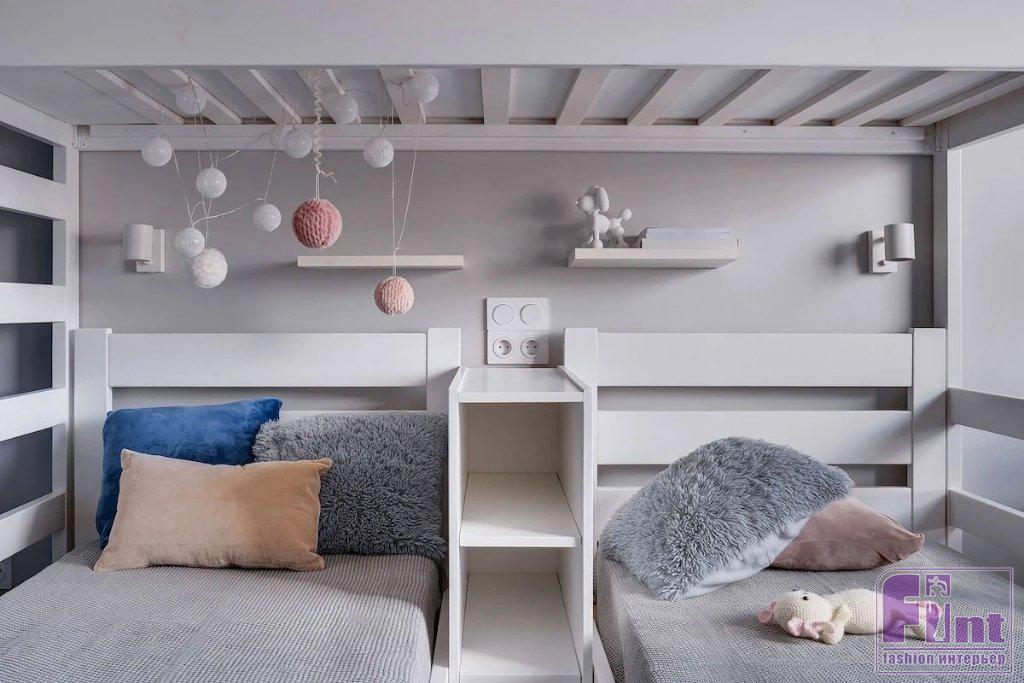 В спальне родителей — кровать с подъёмным механизмом, что даёт возможность хранить внутри кровати подушки, одеяла и постельное бельё. Чтобы уместить в небольшой детской спальные места для трёх девочек, на заказ сделали три кровати — одна из них, высокая, стоит над двумя другими. В санузлах — тумбы под раковину. Причём в родительском санузле уместили две раковины и, соответственно, две тумбы — очень удобное решение для пары.