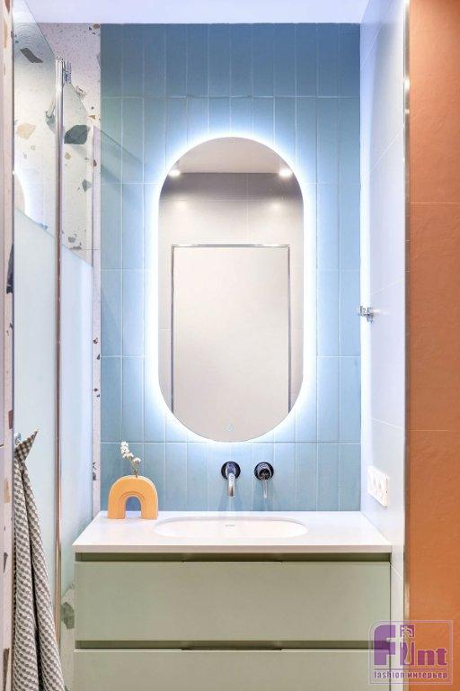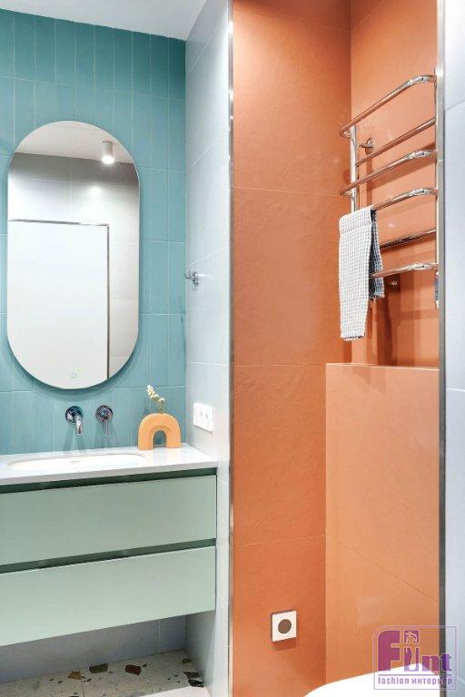 Детский санузел выделяется среди основной цветовой гаммы. Здесь использовали более яркую голубую плитку, терраццо и оранжевую керамику. «В каждом санузле мы скомбинировали три и больше вариантов кафеля, сочетая яркие и сложные цвета и разные фактуры. Ведь где, если не в санузле, самой небольшой комнате, можно и нужно экспериментировать, чтобы каждая стена стала притяжением внимания», — замечает Ксения. Каждая вещь на своём месте, много закрытых систем хранения — таковы были пожелания хозяйки дома. Дизайнер учла их и спроектировала не только шкафы (в прихожей, детской), но и отдельную гардеробную в спальне, а также сохранила кладовую, где теперь умещаются хозяйственные вещи и часть детских.
