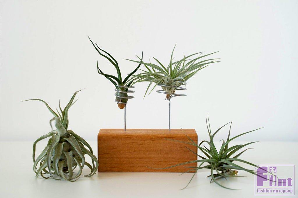 Талландсия — другой привлекательный и скромный по размерам цветок. Он представляет собой пучки продолговатых раскидистых листьев, похожих на крону миниатюрной пальмы. Но не это главная отличительная черта тилландсии. Ей практически не нужна почва, а только воздух — именно из него растение-эпифит получает необходимые вещества и влагу. Для этого на длинных листьях расположены мелкие чешуйки, а вот корней почти нет.