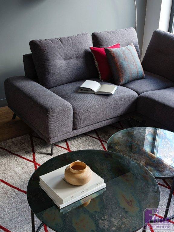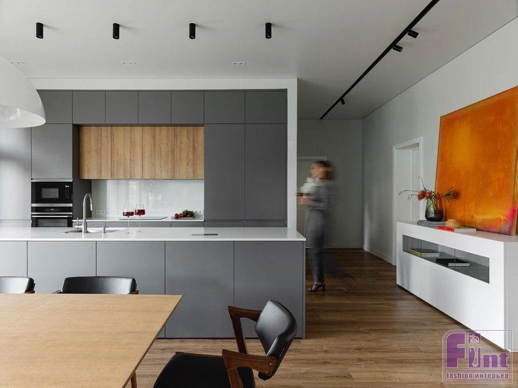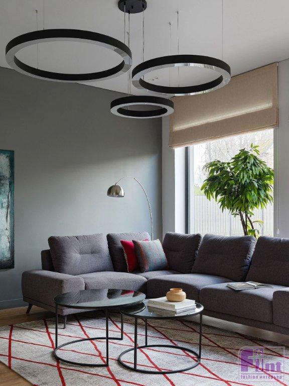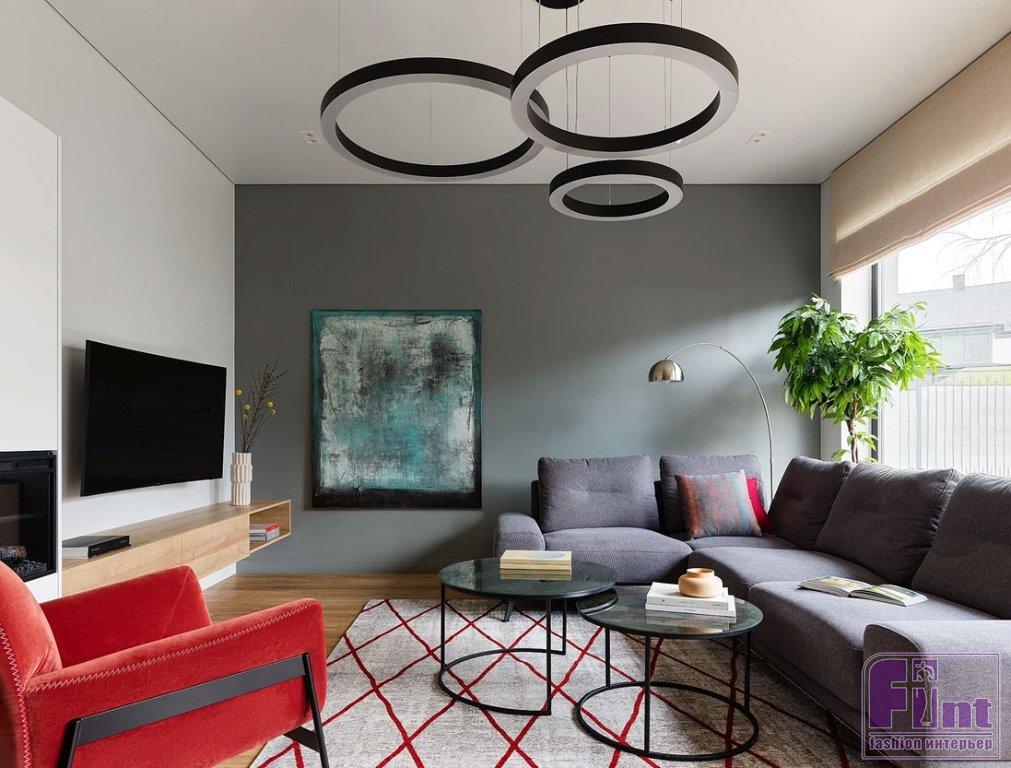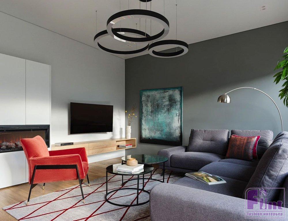 Заказчикам требовался сдержанный интерьер, который стал бы фоном для памятных вещей и новых приобретений. Они не стали перевозить прежнюю мебель, хотели полной смены обстановки. Дизайнер старалась добиться гармонии за счёт цельности концепции пространства и единства колористической палитры. Поэтому во всех помещениях присутствуют повторяющиеся цветовые решения и материалы. Ведущим фоновым тоном стал подобранный вместе с заказчиками оттенок серого. Он использован и в гостиной, и в других комнатах, и в санузлах, и во вспомогательных помещениях. Приём позволил создать ощущение единого объема интерьера.
