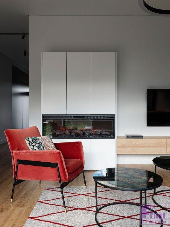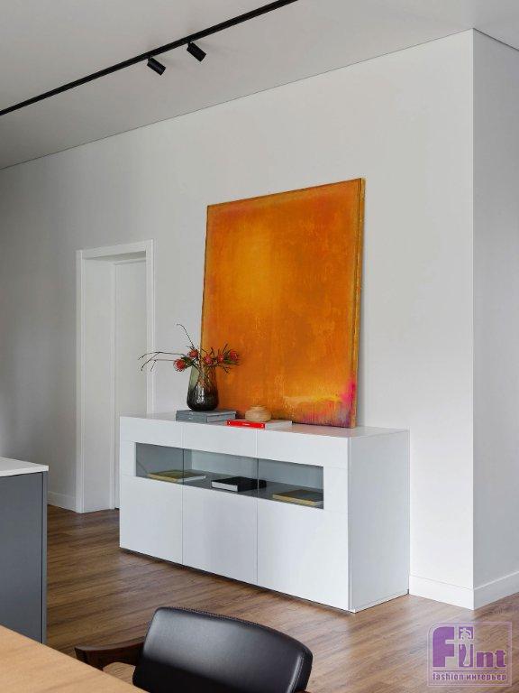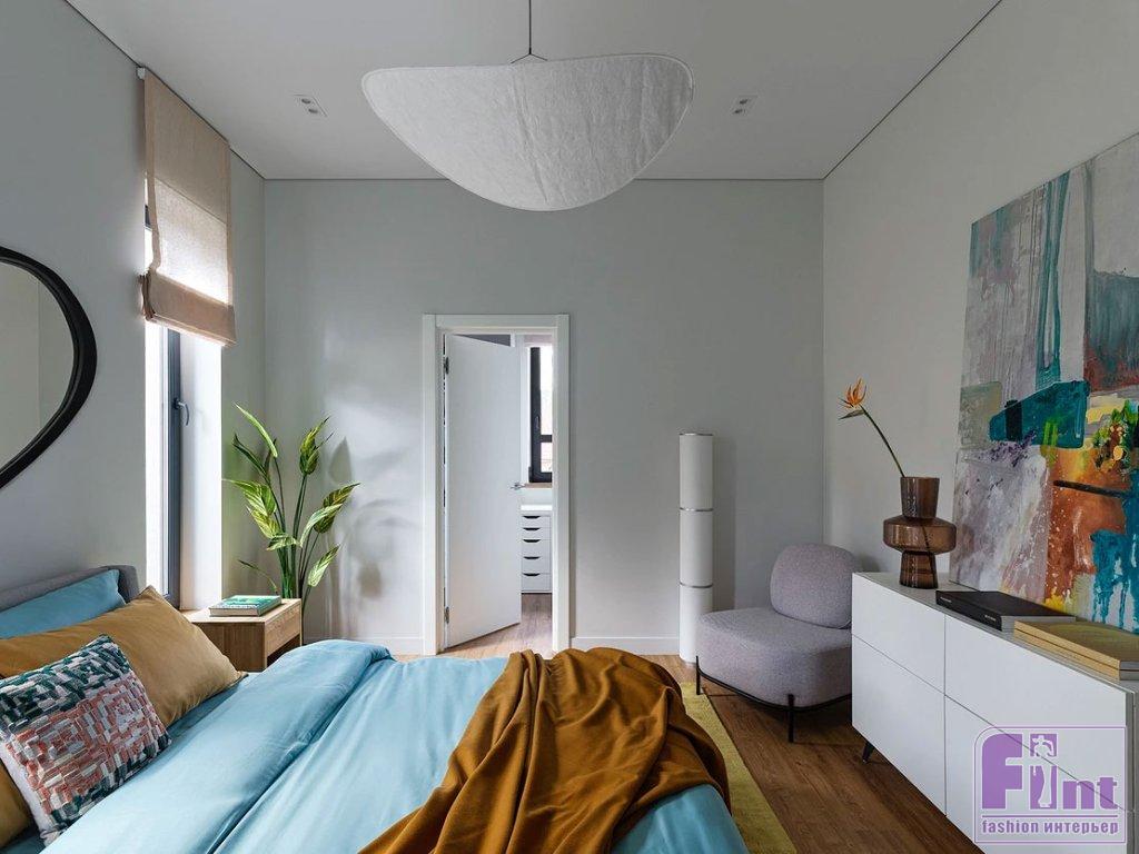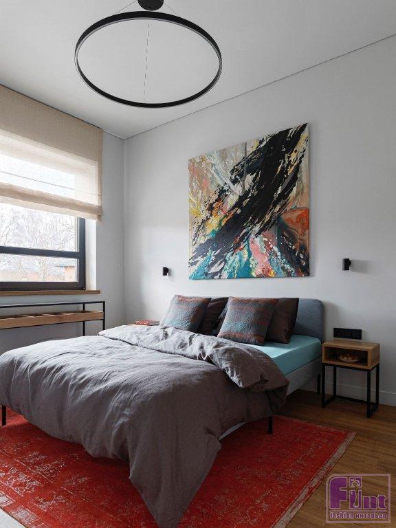 Искусственное освещение гостиной обеспечивает выразительная композиция из современных светодиодных светильников. В их функционале предусмотрена возможность регулировки, как интенсивности светового потока, так и световой температуры (можно задавать белый или желтый цвет свечения). Журнальный столик-«матрёшка» округлой формой и глянцевым покрытием вторит потолочным светильникам. За счёт скошенных краёв столешницы обеденный стол не выглядит слишком массивным. Барная стойка, за которой заказчики с удовольствием завтракают, снабжена дополнительными местами хранения. В основной спальне зеркало над изголовьем кровати повесили так, чтобы в нем отражалась яркая картина на комоде. Пятнам цвета на полотне вторит гамма текстильных изделий.
