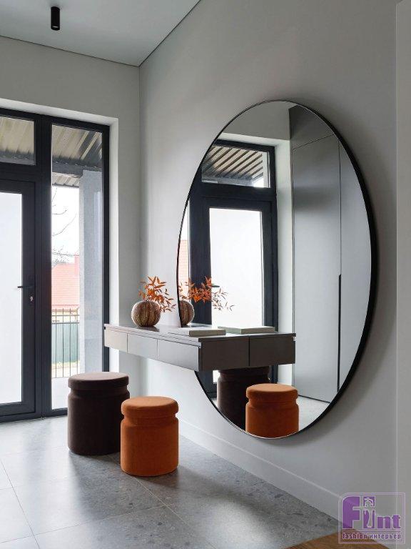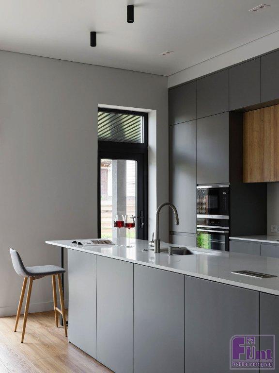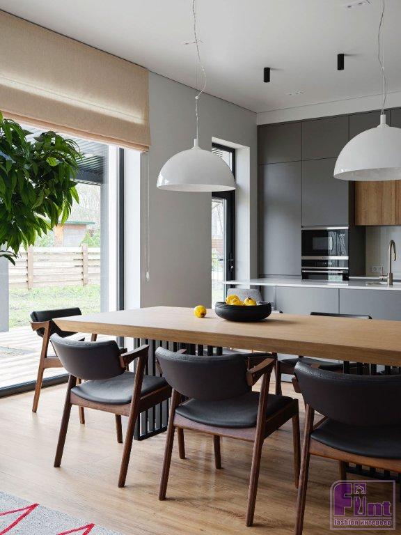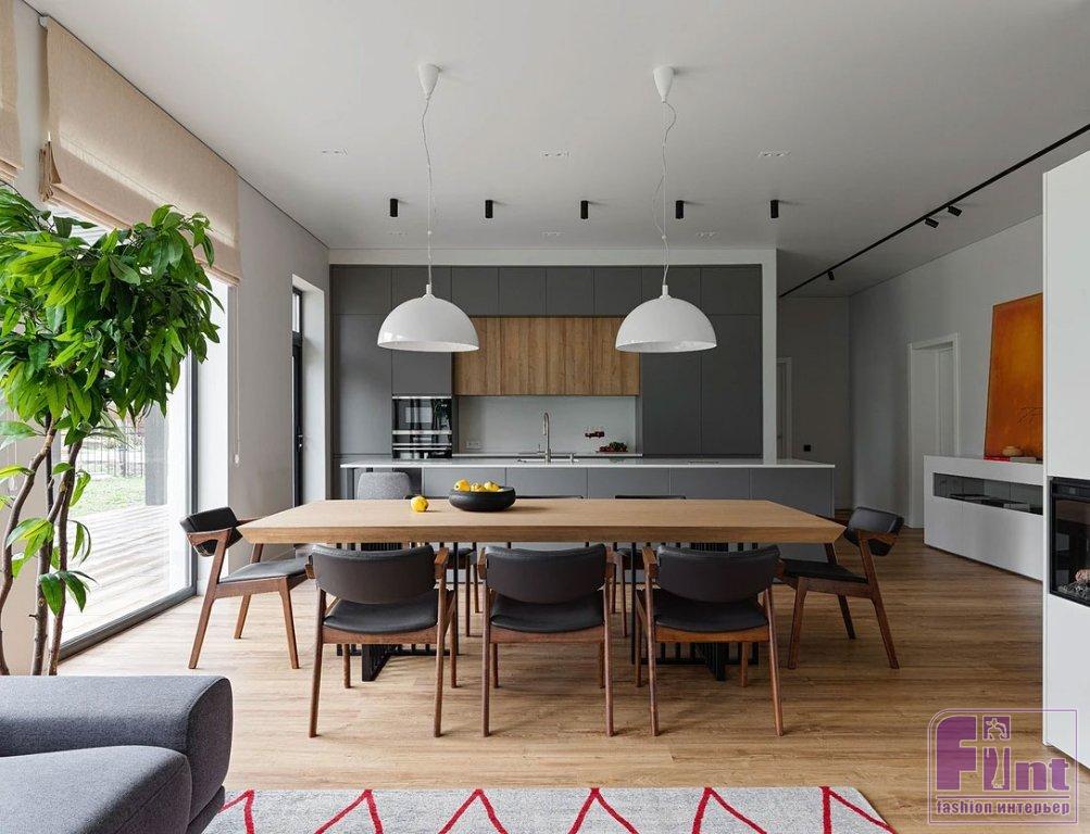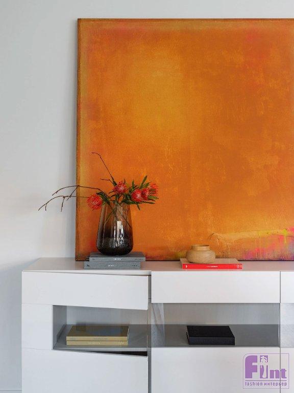 Прямо с порога интерьер впечатляет неординарными современными решениями. Сквозь вертикальную фрамугу входной двери естественный свет попадает в прихожую. Консольный столик словно парит в воздухе. Яркий акцент в холле, объединенном с кухней-гостиной, — абстрактное полотно в позитивных оранжевых оттенках. По колориту оно идеально сочетается с деталями помещений общего назначения. Гостеприимная кухня-гостиная соединяется с пространством проходного холла, откуда можно попасть в разные помещения. Связанные зоны объединяет единая цветовая гамма. Благодаря почти панорамному остеклению в репрезентативной зоне очень светло, особенно в ясные дни. Близость к природе подчеркнули поверхностями из дерева.
