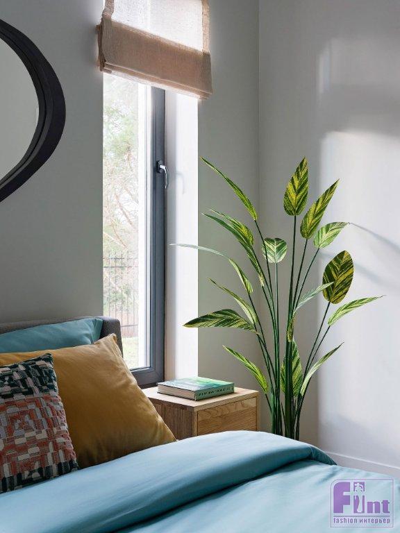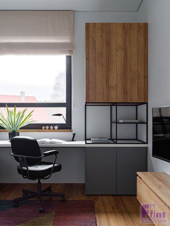 Гостевая спальня из-за металлических деталей имеет выраженный мужской характер. Яркий ковёр, колоритное абстрактное полотно и подобранный ему в цвет текстиль создают настроение для позитивного отдыха. Интерьер кабинета исполнен в общей для всех помещений дома стилистике. Фактурный цветастый ковёр с геометрическим рисунком призван заряжать энергией, помогая таким образом проведению деловых встреч и приватных бесед, но не отвлекая от работы за столом. С учётом всех пожеланий интерьер получился воздушным и естественным — с множеством природных фактур и с оригинальным и выразительным декором.