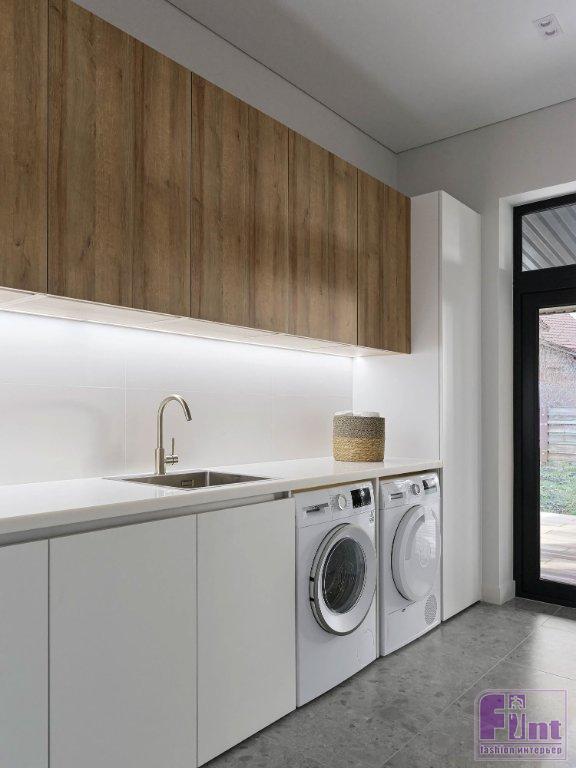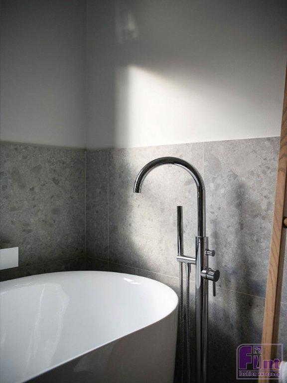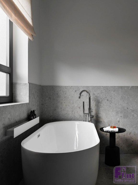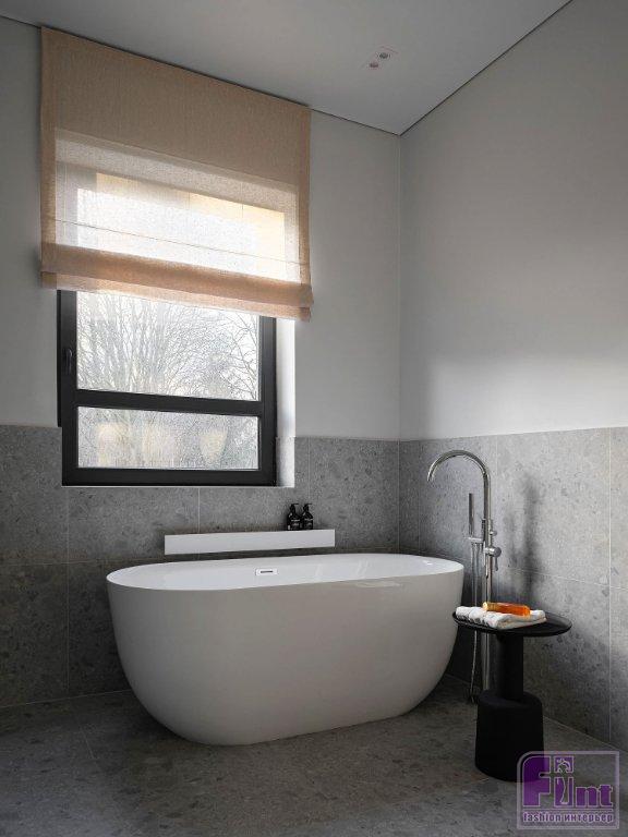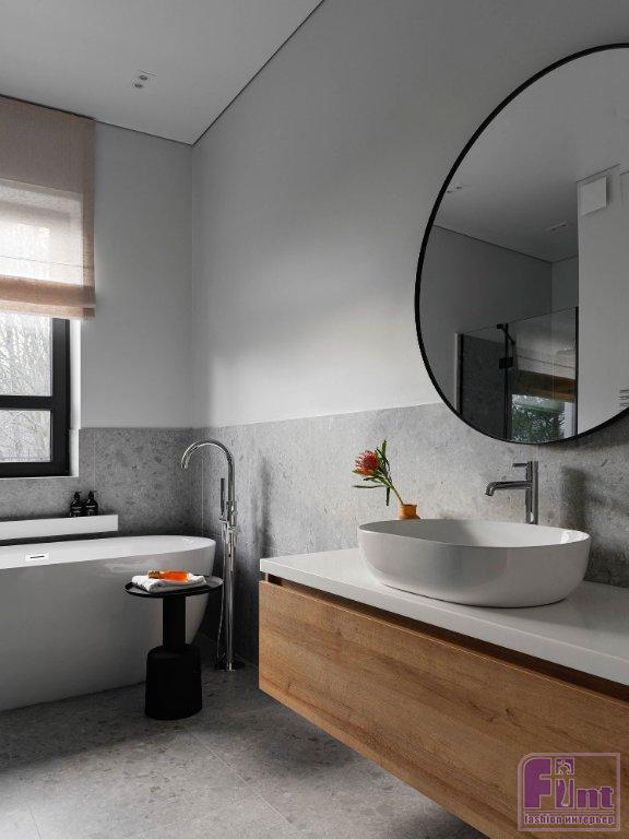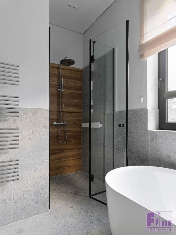 Ванная комната исполнена в том же цветовом сочетании, что и основные помещения дома: ведущий фоновый тон (оттенок серого) плюс элементы отделки деревом и керамогранитом. Для большего удобства использования помещение оборудовано как отдельно стоящей купелью, где можно полноценно расслабиться, так и душевой нишей. Душевую собрали с учётом геометрии помещения и удобства использования, подобрав и установив отдельные компоненты: душевую и сливную системы, ограждение и необходимые аксессуары. На стадии прокладки коммуникаций в доме сделали скрытую в стенах и в полу разводку труб горячего и холодного водоснабжения. Отвод воды в душевой зоне обеспечивает незначительный уклон пола в сторону душевого трапа с большой проходной способностью — почти незаметной «щели» в полу. Компактная душевая стойка и распашная створка ограждения из прозрачного стекла делают душевую зону органичной частью пространства санузла.