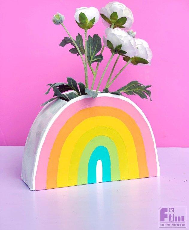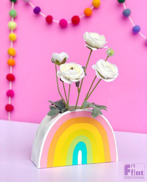 В этой необычной и яркой вазе из полимерной глины объединены дары природы и природные явления, характерные для летней поры. Лето – это буйство красок в природе, когда повсеместно распускаются самые разнообразные цветы. А ещё летом частенько случаются грозы и дожди, после которых наступает новая волна цветения, а на небе появляются потрясающие радужные арки. Именно радугу и летние цветы мы соединим в этом проекте DIY, сделав своими руками необычную яркую вазу из самой простой полимерной глины.