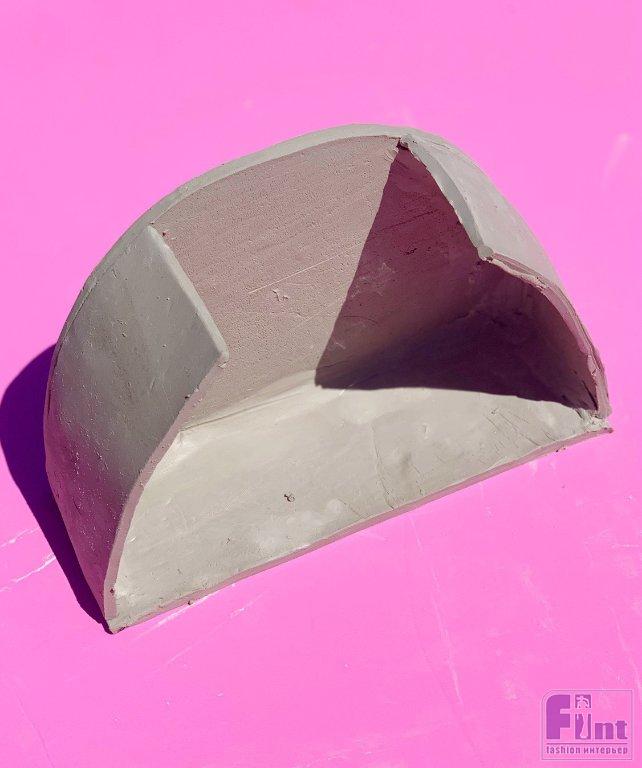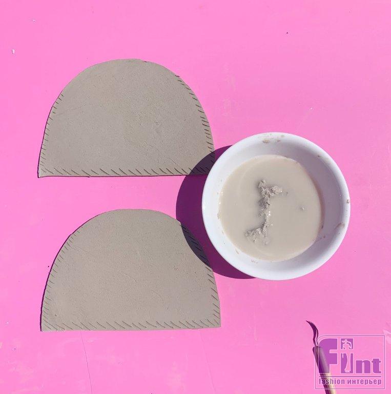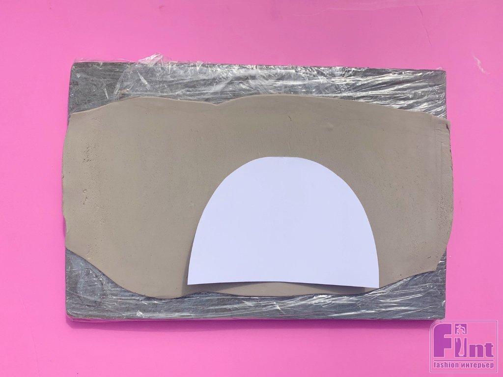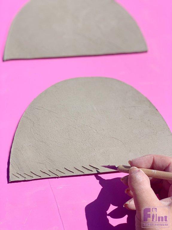 После того как вы раскатаете глину в пласт толщиной около 5-7 мм, возьмите трафарет и положите его поверх глины. Обведите трафарет ножом, и вырежьте нужную форму в виде сегмента круга. Сделайте две одинаковых полукруглых заготовки, которые являются передней и задней частью будущей вазы.