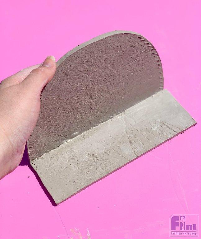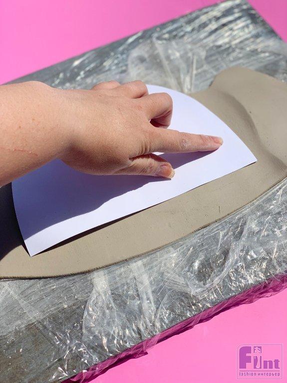 Как только как вы сделаете переднюю и заднюю часть вазы, вам необходимо сформировать детали для боковин и дна вазы. Раскатайте еще один кусок полимерной глины и снова положите на него трафарет. Вместо того чтобы обводить всю форму, как вы делали при изготовлении полукруглых деталей, используйте только прямую сторону трафарета. Длина прямой стороны трафарета точно соответствует нижней части вазы – дну. Теперь определите ширину вашей будущей вазы, чтобы вырезать прямоугольнику. Мы решили сделать вазу шириной около 5 см. Именно такой ширины вам необходимо вырезать прямоугольник из полимерной глины.