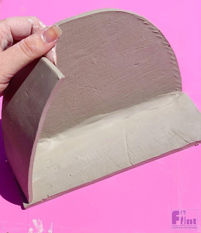 Сделайте ещё два аналогичных прямоугольника, которые станут боковыми поверхностями вазы. Дайте всем заготовкам немного подсохнуть, пока они не станут жёсткими, но не слишком сухими. Глина по-прежнему будет скорее серого цвета, чем белого, но вы сможете держать заготовки так, чтобы они не прогибалась под своим весом. В местах соединения деталей вазы сделайте насечки, которые помогут деталям плотнее и прочнее соединиться между собой.