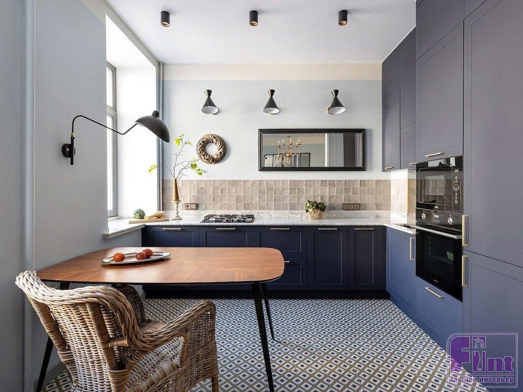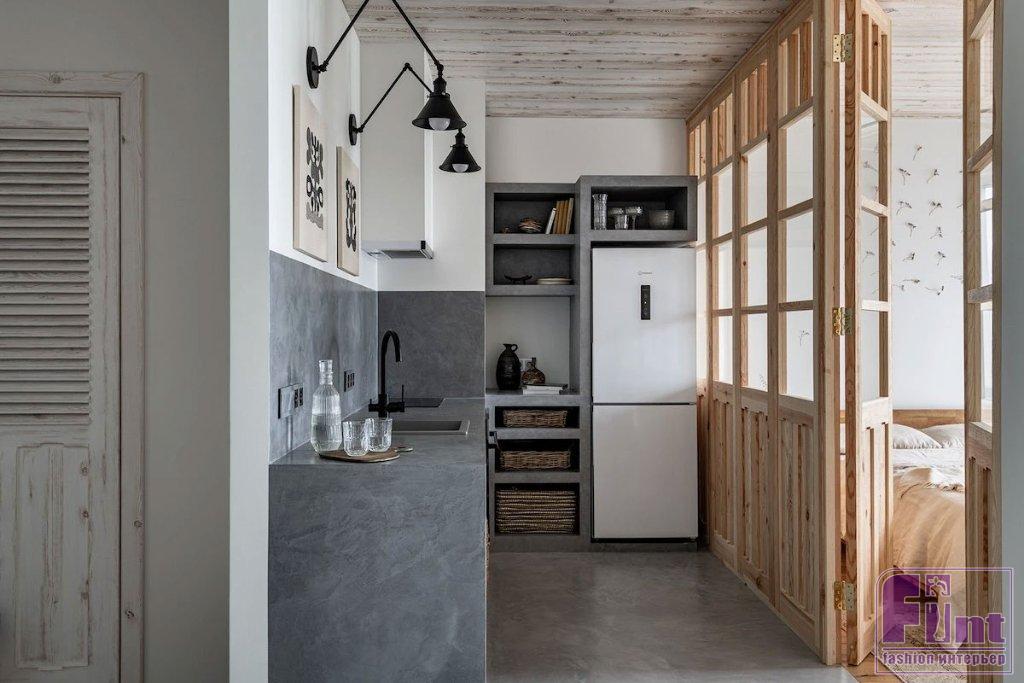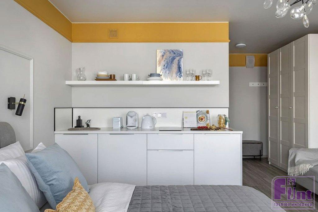 Этот проект дизайнера Виктории Бутвиной — квартира для сдачи в краткосрочную аренду, и кухня здесь соответствующая цели: компактная, не особенно выделяющаяся, так как расположена в общем студийном пространстве. Верхних шкафов нет, они заменены полкой для посуды и декора, выполненной в цвете и стилистике нижних шкафов кухни. Получилось очень гармонично.