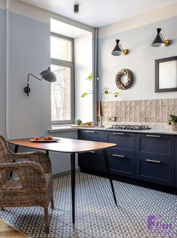 Проект дизайнера Натальи Васильевой — ремонт в квартире её институтских друзей, семьи с детьми. Верхних шкафов на кухне нет, объём хранения компенсирован высокими колоннами по другой стене кухни. Над рабочей же поверхностью — декоративные аксессуары. Крупное прямоугольное зеркало — выглядит изящно, роскошно и немного увеличивает пространство. К тому же добавляет стильный дух «ретро» — подобный приём с зеркалами раньше использовали в оформлении диванных зон. А также декоративный «венок» и три одинаковых настенных бра, которые подсвечивают рабочую зону.
