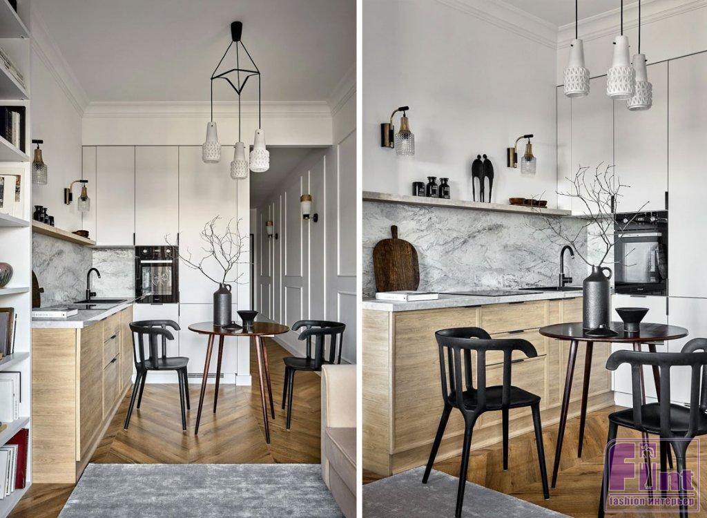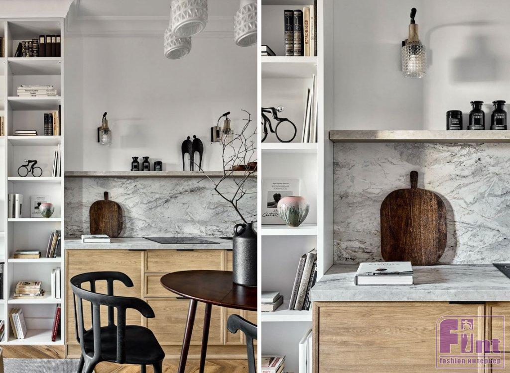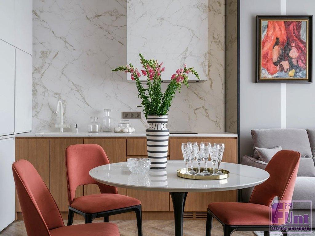 Эта квартира по проекту дизайнера Светланы Воронцовой создавалась заказчиком в подарок для своей мамы. Здесь на кухне применили тот же прием, что и в предыдущем проекте — верхние шкафы по одной стене компенсировали высокими колоннами, которые заняли всю другую стену. Пространство стены над столешницей оформлено керамогранитом под мрамор, которым отделан, в том числе, и короб канальной вытяжки. Благодаря такому решению короб буквально «сливается» со стеной. За счёт фактуры пространство не выглядит пустым.