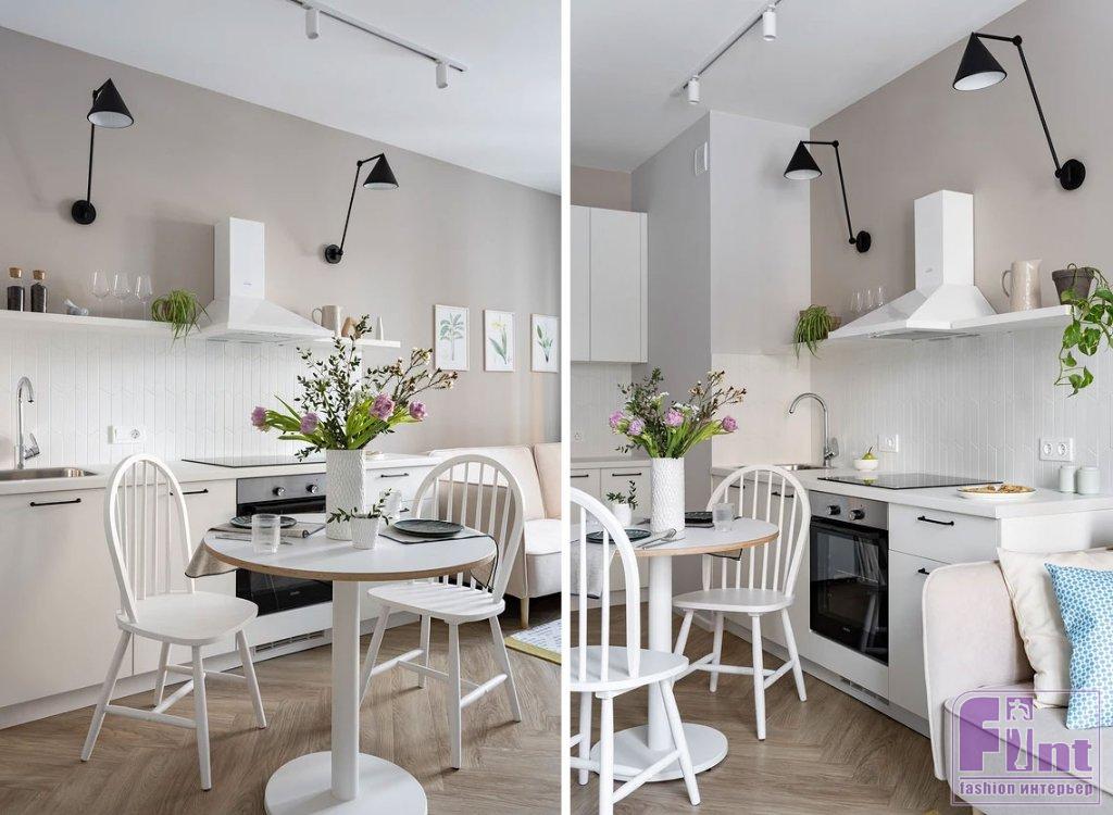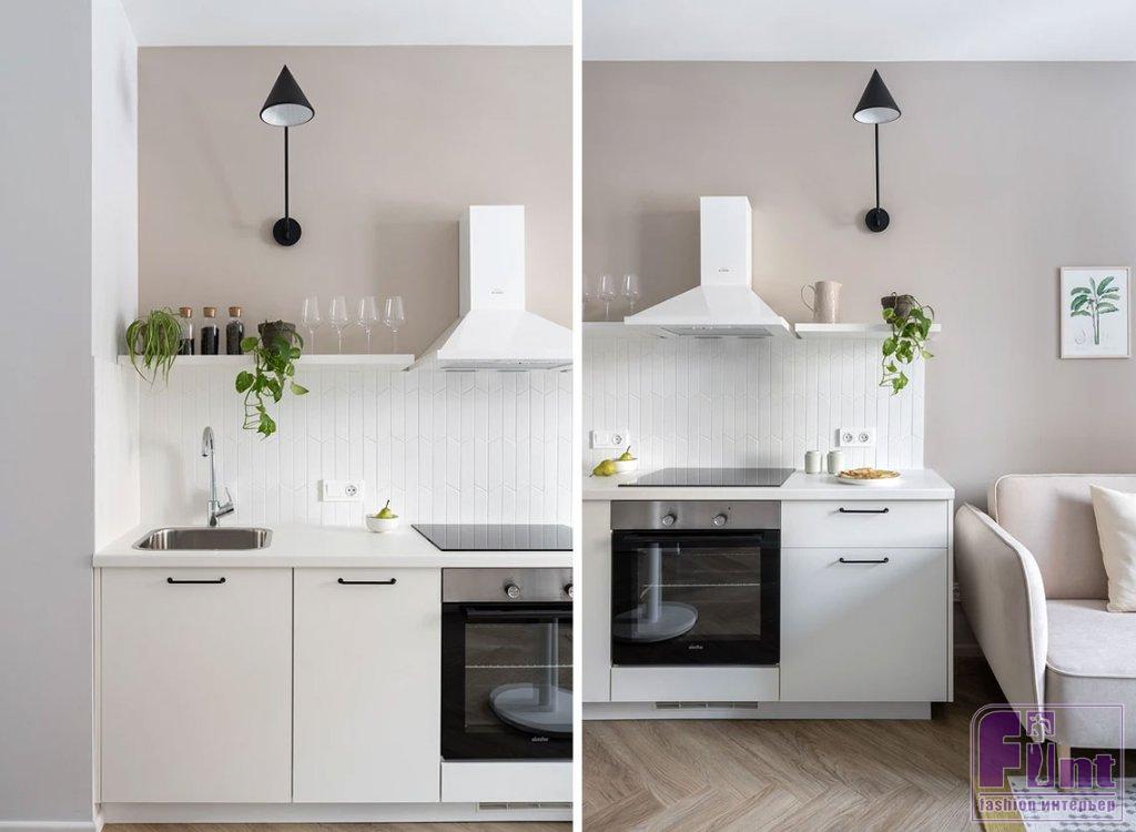 Проект дизайнера Анастасии Заркуа — квартира для последующей сдачи в долгосрочную аренду. Чтобы облегчить визуально пространство кухни-гостиной и сэкономить на кухне, верхние шкафы здесь только по одной стене — в нише с холодильником. Основная же часть — без них. Над столешницей подвешена вытяжка и две симметричные полки с декором. Графичности добавляют крупные настенные бра контрастного чёрного цвета. Они отлично сочетаются с чёрными ручками на фасадах шкафов и чёрной кухонной техникой.