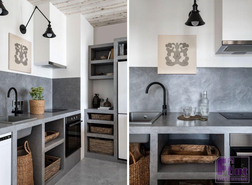 В квартире дизайнера Катерины Караваевой необычная кухня. Она собрана из бетонных блоков по проекту автора и покрыта микробетоном — вся, включая фартук. Верхних шкафов, как таковых, нет. В той части, где стоит холодильник — подвесной модуль с открытыми полками. Над основной рабочей поверхностью — ручная вышивка, два симметрично расположенных бра на длинных ножках, которые можно регулировать, и вытяжка в коробе в цвет стен.