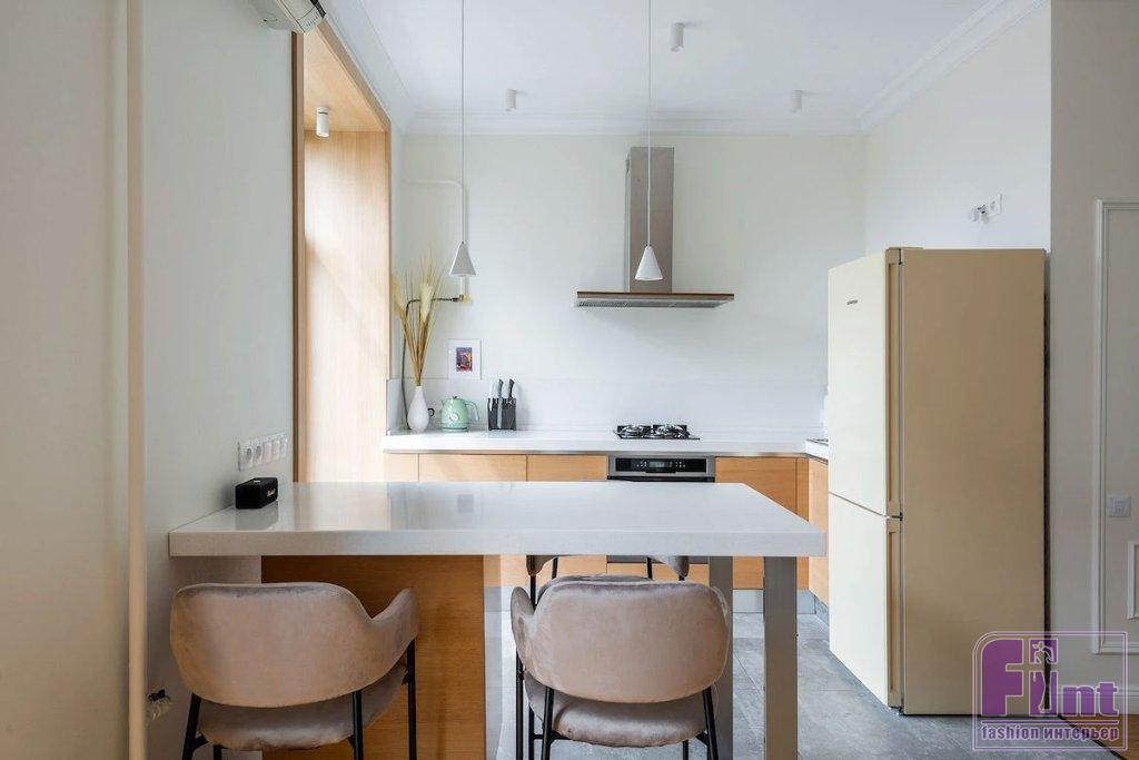 Минимализм — это тренд последних лет, иногда дизайнеры в согласии с заказчиком выбирают полный отказ от верхних шкафов и не заполняют стены ничем. Так, как в этом проекте дизайнера Яны Сахаревич. Над варочной поверхностью размещена только вытяжка. Такое решение позволило добавить ощущение простора и визуального «воздуха» в зону этой небольшой по площади кухни.