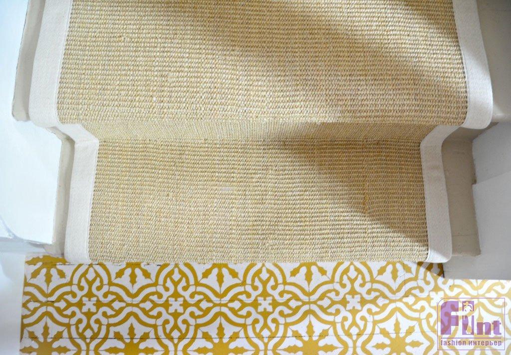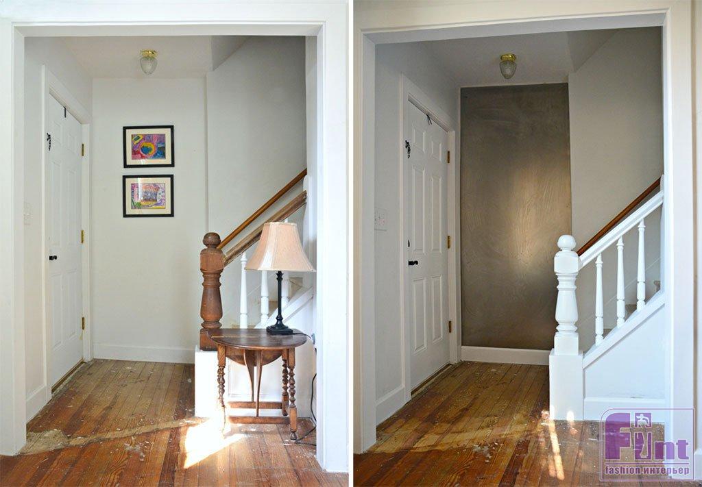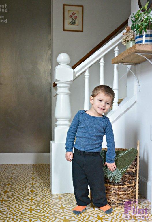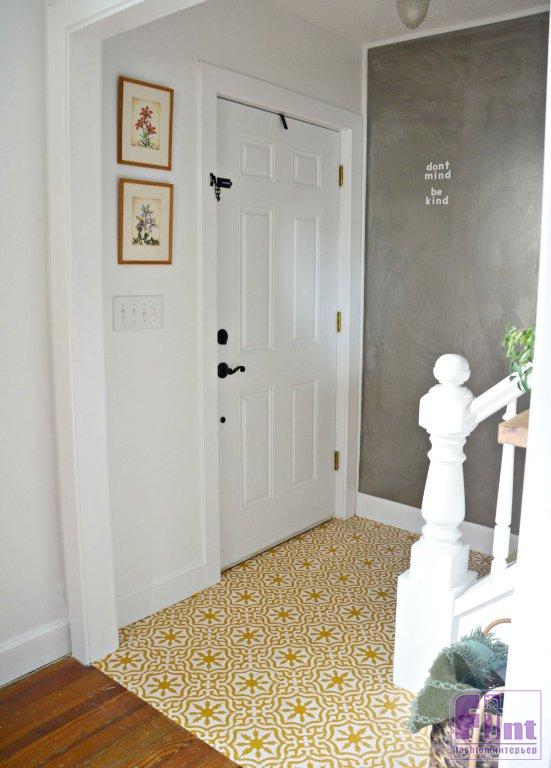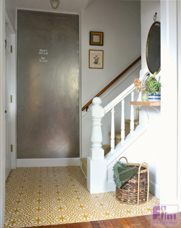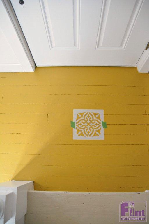 Мы решили оформить декоративным способом небольшую зону около входной двери. Такой выбор позволит простым окрашиванием сделать стильную имитацию керамической плитки, как будто прихожая выложена кафелем с ярким этническим орнаментом в дамасском стиле.
