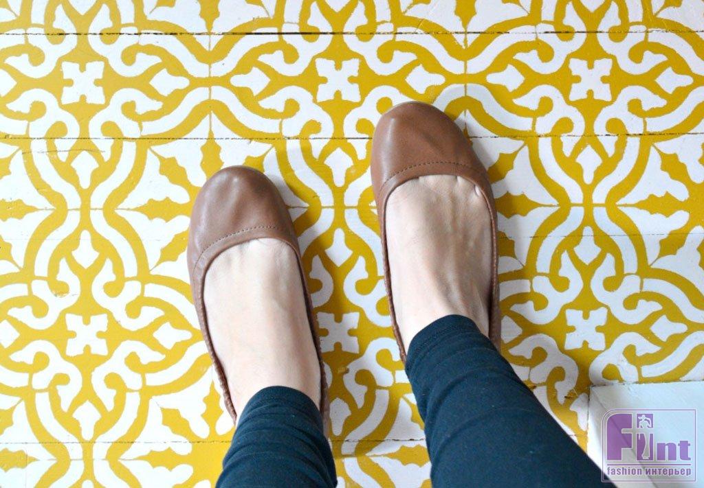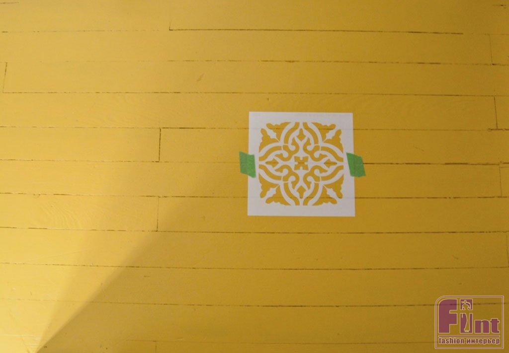 Перемещайте трафарет по поверхности пола, чтобы в итоге получить единый бесшовный орнамент во всей декорируемой зоне. Старайтесь перемещаться от угла к противоположной стороне, чтобы не повредить только что окрашенный участок.