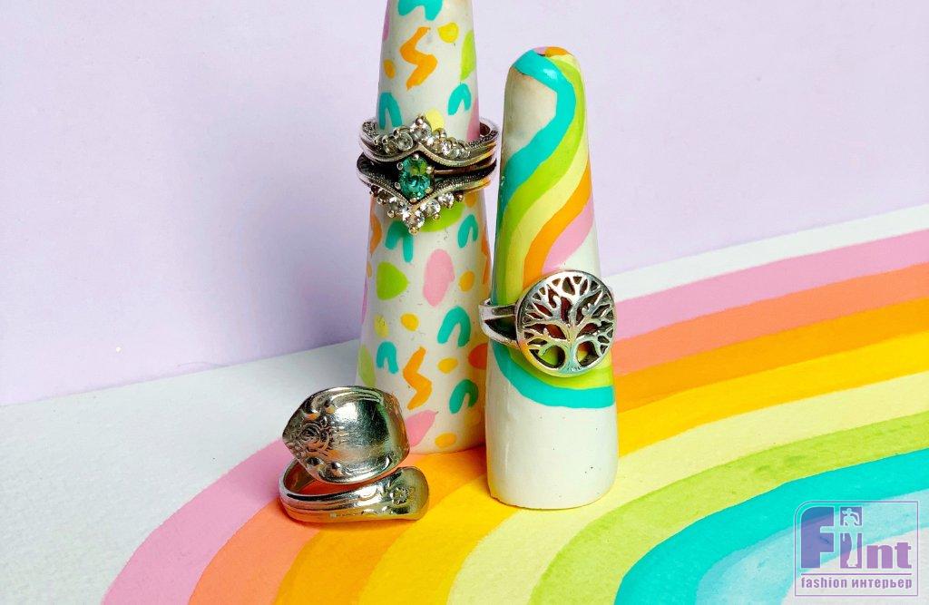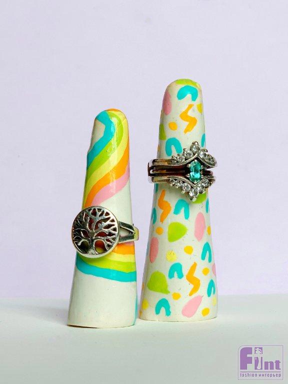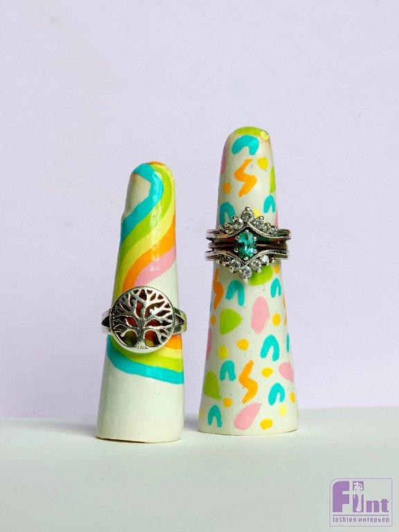 Этот яркий держатель для колец отлично выполняет свою основную функцию: ваши украшения всегда будут под рукой, и вы сможете очень быстро выбрать нужное колечко, чтобы не тратить время на копание в ящичке сундучка или шкатулки. Но ещё этот простой держатель, благодаря яркому декору, станет отличным украшением для вашего интерьера!
