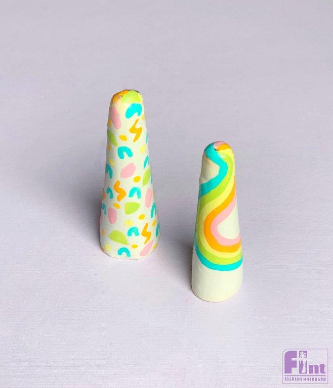 Когда глина высохнет или остынет (если вы использовали запекаемую глину), наступает время для творчества! Используя яркие акриловые краски и кисточку, нарисуйте на конусе орнамент или узор, который вы хотели бы видеть на вашем держателе. Вы можете придумать свой узор, орнамент или способ окрашивания, или воспользоваться нашим вариантом: на одном держателе мы нарисовали яркие цветные пятна различной формы, а другой украсили вариацией на тему радуги. Дайте краске полностью высохнуть.
