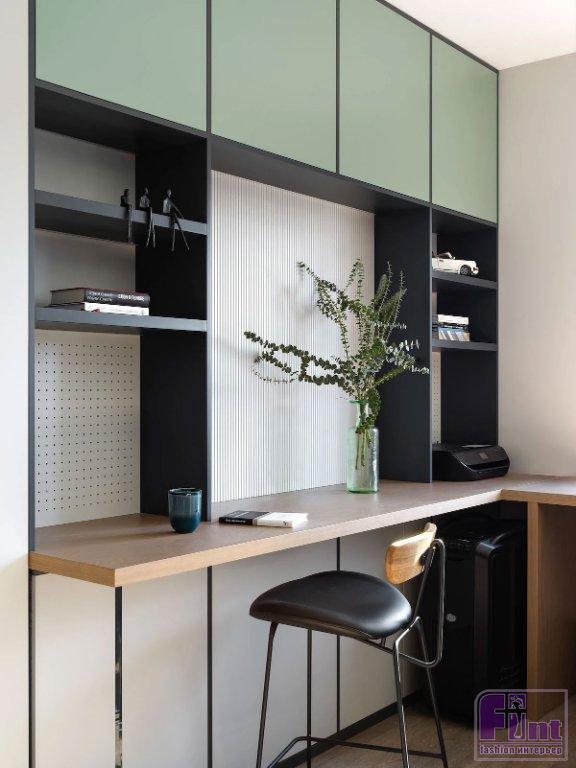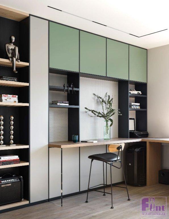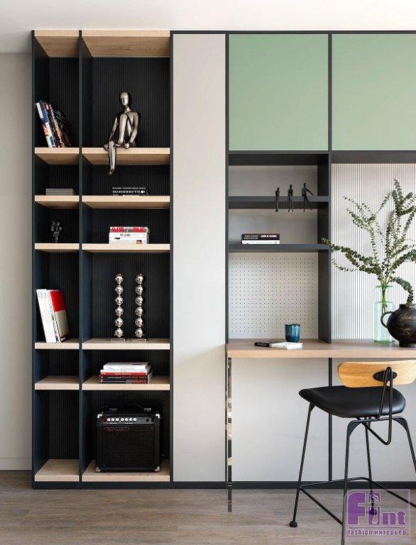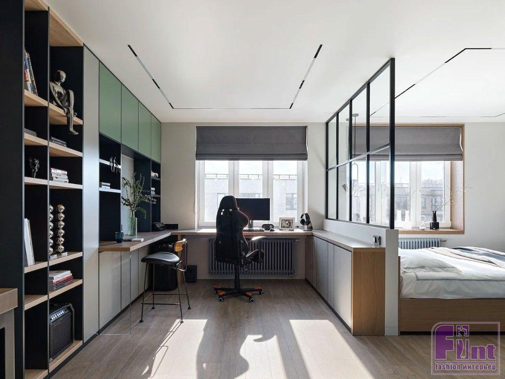 В прихожей предусмотрели шкаф для одежды, крючки для повседневных вещей и полку для разных мелочей, которые удобно положить при входе. Рабочая зона организована на площади гостиной. Здесь П-образная столешница. У окна — основной рабочий стол с монитором и удобным креслом. Под стеклянной перегородкой, которая отделяет спальню — тумбы для хранения, а напротив — система из открытых, закрытых полок, пегборда, а также ещё один стол для работы и хобби хозяина.