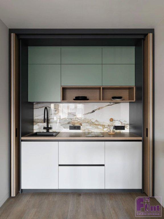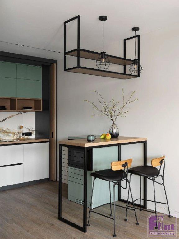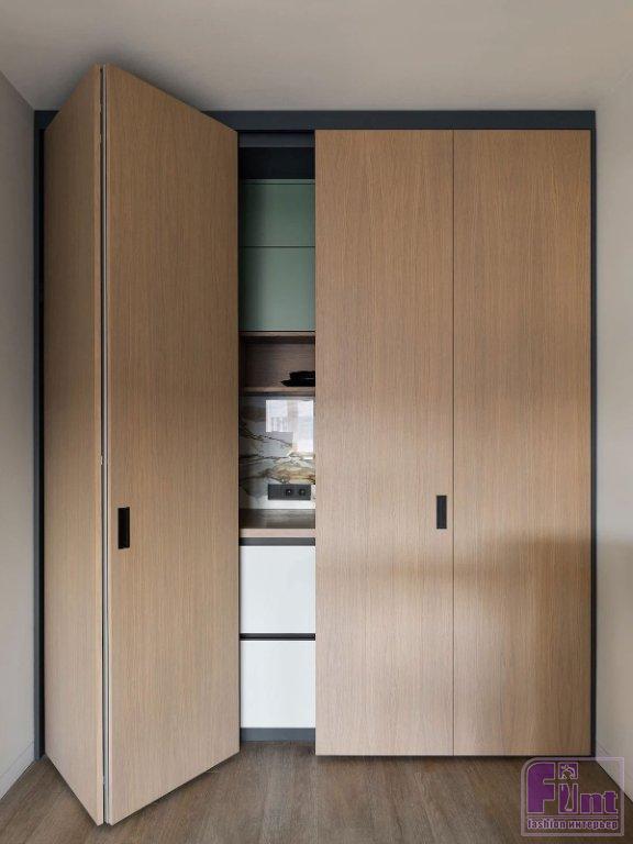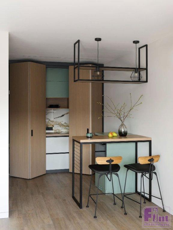 Системы хранения спланировали в соответствии с потребностями хозяина. Так, дома он почти не готовит. Поэтому кухню сделали минимальной — линейный гарнитур с верхними и нижними шкафами, небольшой раковиной, варочной панелью на две конфорки. Но самое интересное — кухню можно скрыть за складными дверями «гормошками». В закрытом виде утилитарная зона выглядит буквально как шкаф. Холодильник встроен отдельно рядом, тоже в шкаф. Обеденный стол заменили полубарной стойкой, а встроенную СВЧ-печь установили в отдельно стоящем модуле-тумбе.