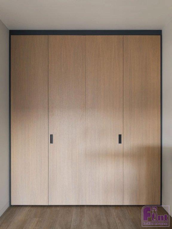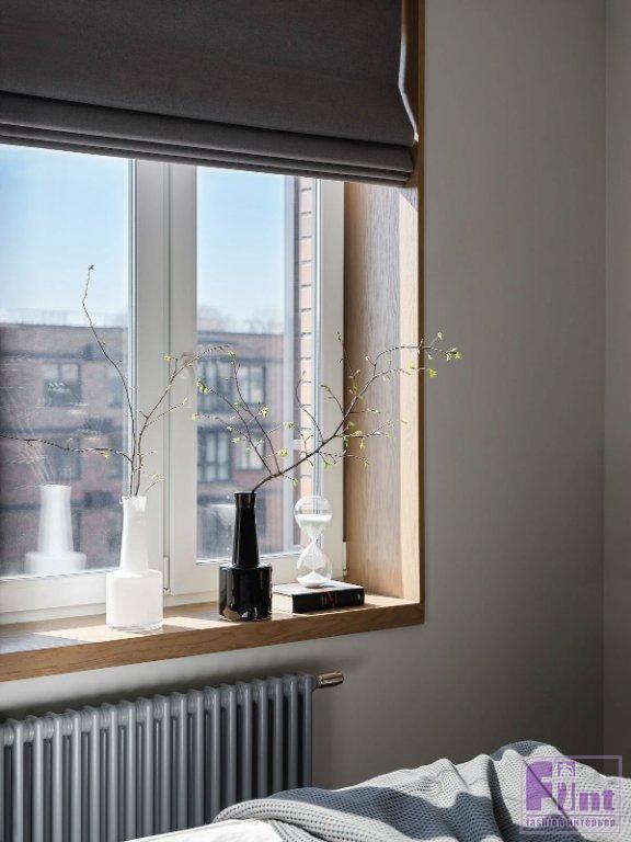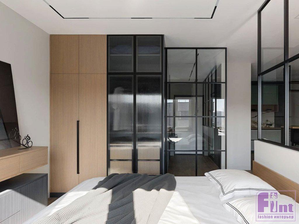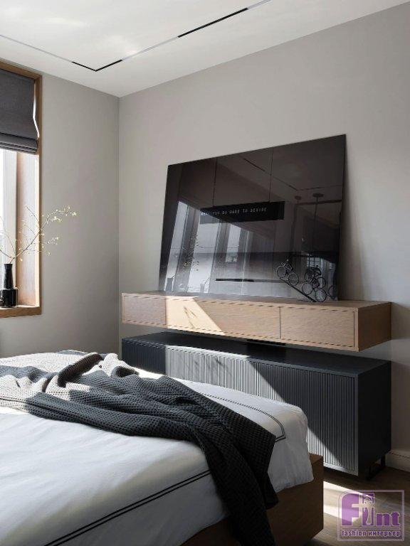 В спальне — встроенный шкаф для одежды (скомбинированы глухие фасады, такие же, как на кухне, и из рифленого стекла — выглядят «легче», но позволяют скрыть возможный беспорядок на полках), а также тумба напротив кровати, состоящая из двух модулей — консоли и напольной тумбы. Тумба разработана для проектора нового поколения, который размещён в выдвижном ящике. Экран не ставили, проектор показывает чёткое изображение и на стену, выкрашенную белой краской.