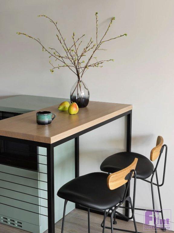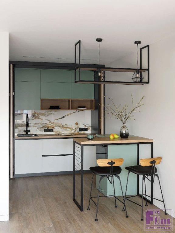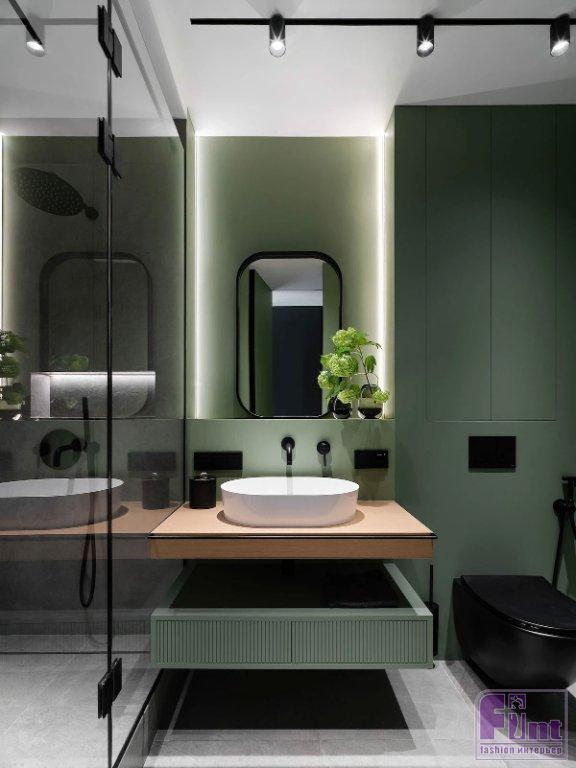 В интерьере решили придерживаться минимализма, поэтому для отделки выбрали достаточно простые материалы. На стенах — краска. На полу — инженерная доска (даже на кухне и в прихожей). Фартук кухни оформлен крупноформатным керамогранитом под мрамор с коричневыми и жёлтыми прожилками. Основной цвет стен — белый, но акценты в виде светлого зелёного введены в мебели. В ванной комнате зелёный раскрылся на максимум. Зелёная краска на стенах в этом помещении сочетается с серой плиткой под бетон в зоне душа и на полу.