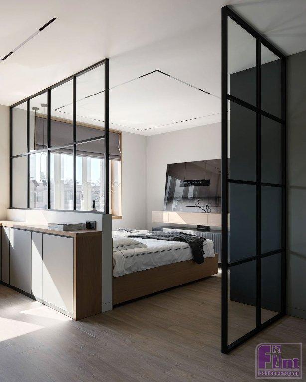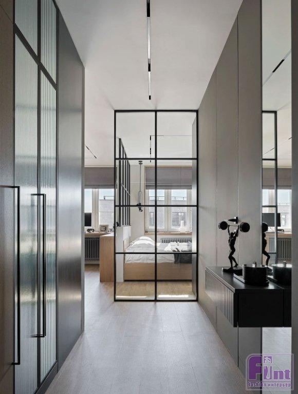 Квартира была евродвушкой. Так называют планировки, где есть кухня-гостиная и небольшая изолированная спальня. В этом случае были ещё и раздельные ванная с санузлом. Так как заказчик живёт один, решили оформить студийное пространство. Перегородки между кухней-гостиной и комнатой разобрали. Поменяли их на стеклянные перегородки с чёрным профилем. Благодаря этому, солнечный свет попадает даже в прихожую. Стенку между прихожей и кухней также перестроили, чтобы вписать системы хранения. Объединили ванную с санузлом.