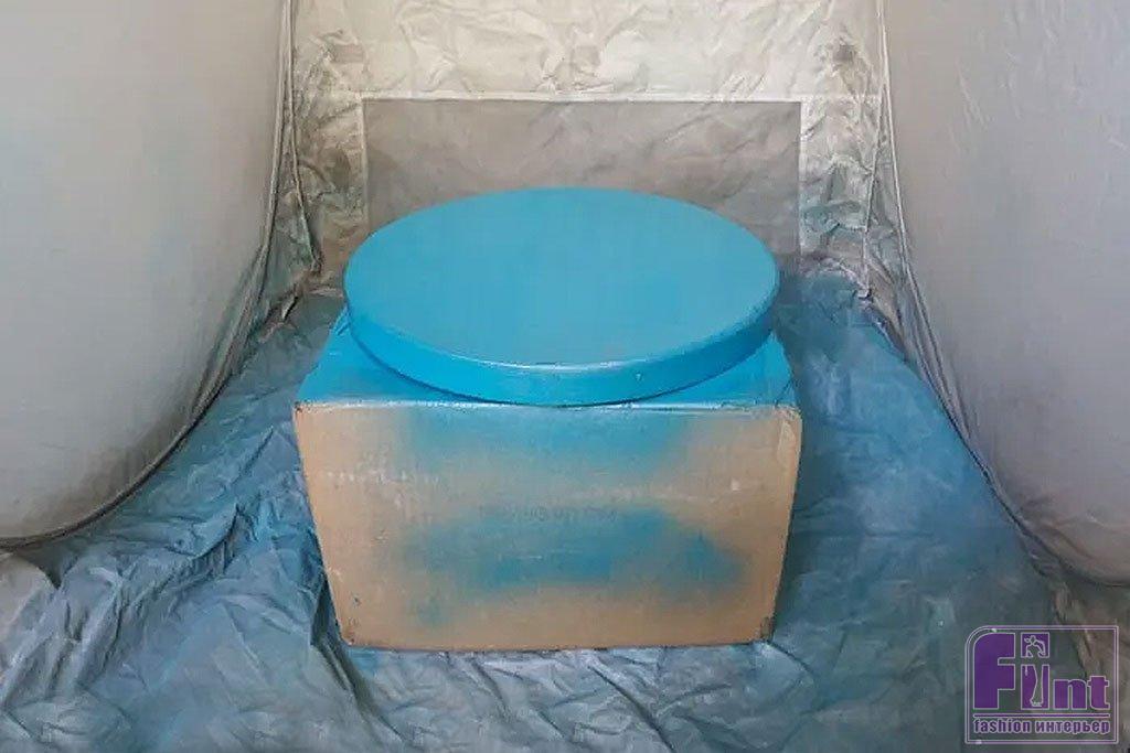 Нанесите на крышку несколько легких и тонких слоёв аэрозольной краски. Мы выбрали красивый бирюзовый оттенок, который будет отлично сочетаться с цветовой гаммой нашего интерьера. Вы можете выбрать любой цвет, который вам больше нравится и подходит к дизайну интерьера вашего жилья. Дайте крышке полностью высохнуть. После этого вы можете подкрасить черный край по мере необходимости.