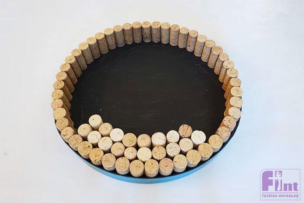 Когда краска высохнет, мы приступаем к созданию доски из винных пробок. Вы можете потратить время на пробную установку винных пробок в крышку без клея, чтобы убедиться, что они подойдут так, как вы хотите. Это необязательный шаг, но если вы перфекционист, то он не будет лишним.