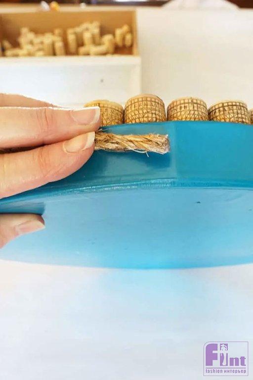 Закрепите один конец пеньковой верёвки внизу пробковой доски, а затем обмотайте её петлёй вверх и вокруг, оставляя сверху запас верёвки формирования петли. Перережьте веревку острым ножом, когда её длина вас устроит. Прикрепите два конца верёвки горячим клеем к нижней части доски из винной пробки в центре. Продолжайте приклеивать веревку, пока не дойдете до места, где она естественным образом должна отделяться от крышки.