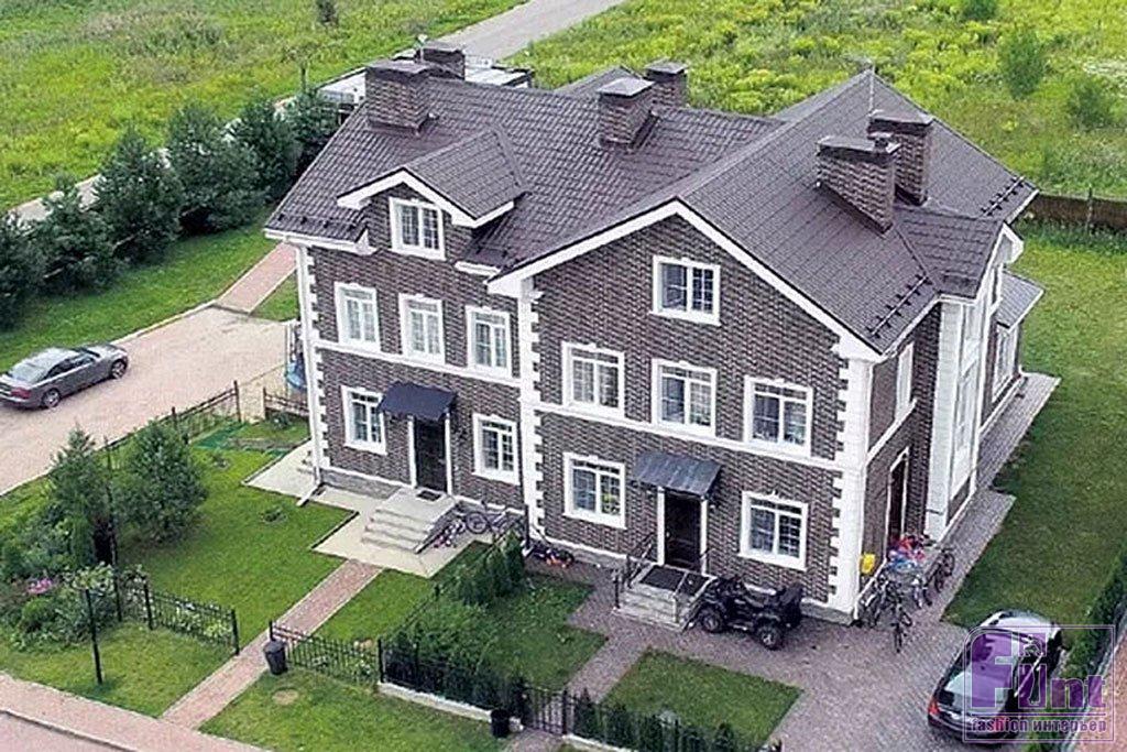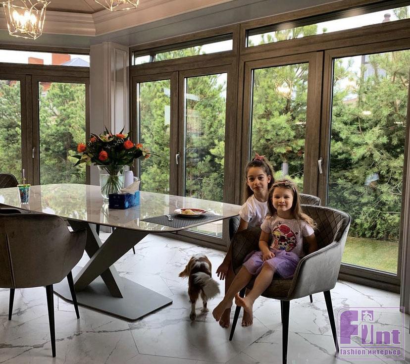 При перепланировке к дому пристроили веранду с панорамными окнами, где поставили овальный стол, и теперь обеденная зона переместилась сюда. По периметру участка вокруг дома Ксении Бородиной посажены туи и ели. За домом – лужайка с газонной травой, где играют дети, а хозяйка занимается йогой. Дорожки заасфальтированы, имеется место для парковки многочисленного автопарка Бородиной.