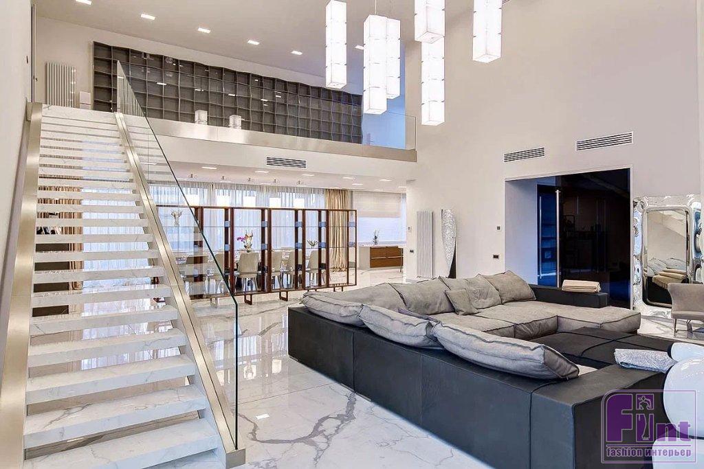 Площадь особняка составляет 216 кв. м. На первом этаже находится большая гостиная в серо-бежевых тонах со стеной, отделанной мрамором. Главный акцентный элемент гостиной – шикарный камин, на фоне которого Ксения очень любит фотографироваться. В кухне-столовой установлен светлый гарнитур с мраморными столешницей и барной стойкой. Мрамором же отделаны прихожая, межэтажная лестница и ванная комната Ксении.
