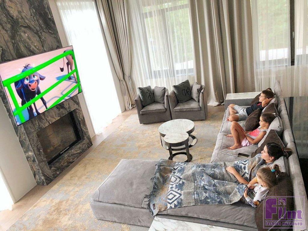 Особое внимание в интерьере телеведущая уделила размещению архивных фотографий детей, которые она оформила в специальные рамки. На первом этаже расположилась стильная панорамная гостиная с выходом на открытую веранду и внутренний сад. В пространстве, выдержанном в общем стиле, нашлось место комоду из черного дерева, нескольким растениям, полотну современного художника, большому дивану пепельно-серого оттенка и даже массажному креслу за миллион рублей.