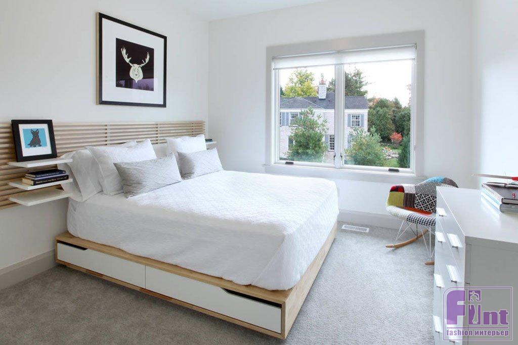 В первую очередь речь идёт о мебели с дополнительным хранением. Кровать с выдвижными ящиками или подъёмным механизмом поможет более организованно хранить вещи и избежать их скопления на спинке стула и в других местах, для этого не предназначенных. Как следствие, в интерьере будет меньше пыли, да и визуального беспорядка поубавится.
