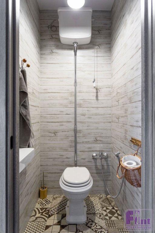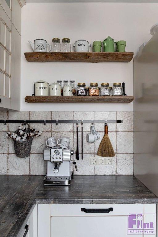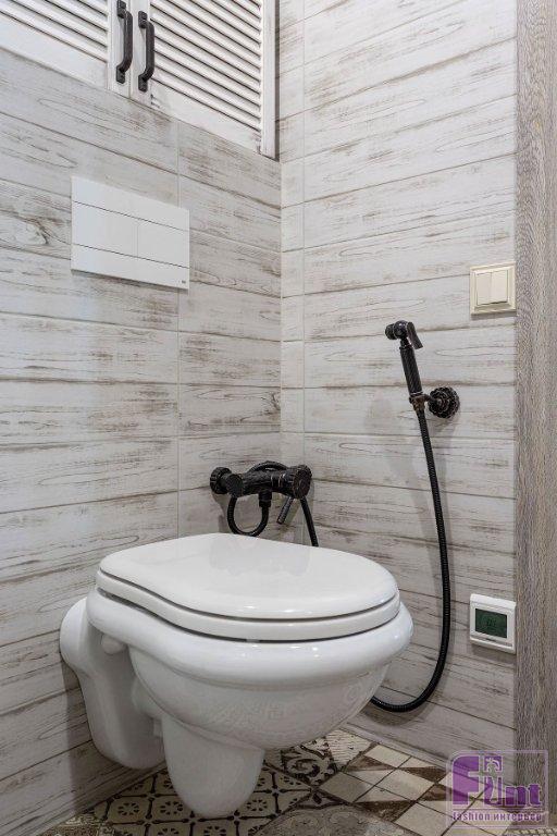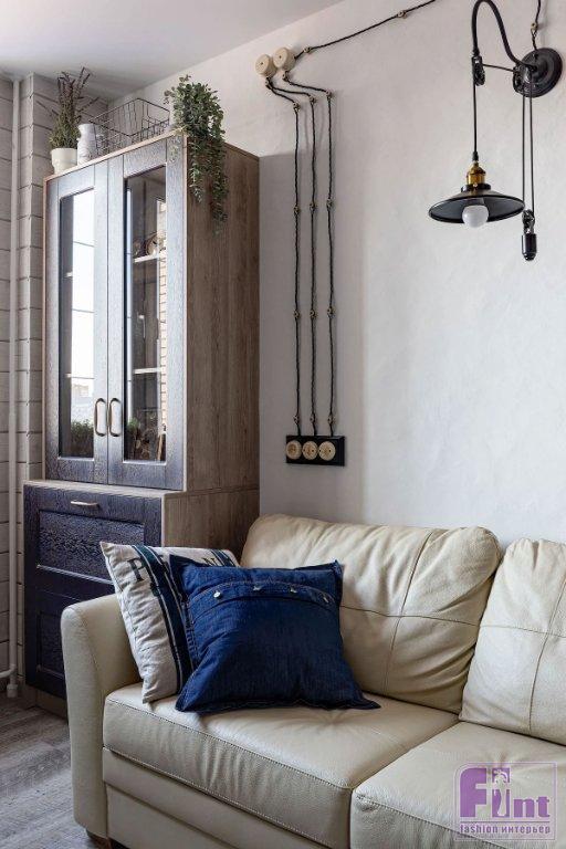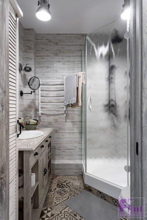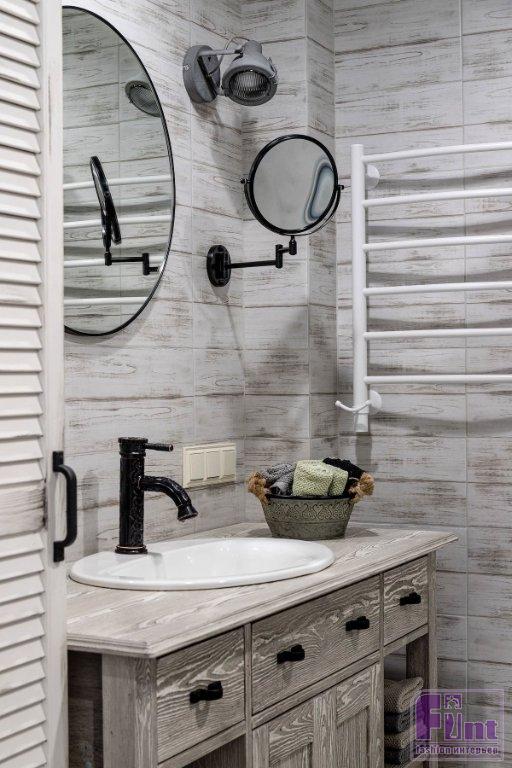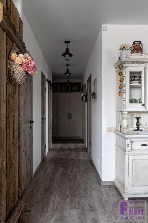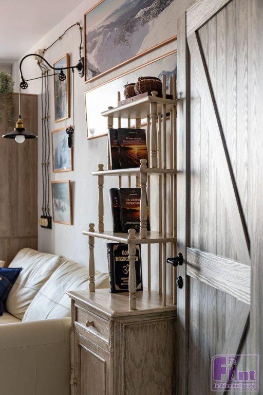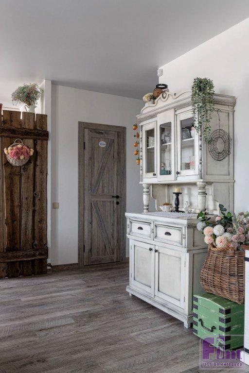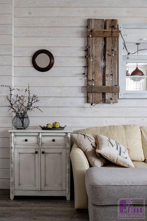 Отделочные материалы должны были отвечать заданной концепции интерьера. На стенах — мазанка. Сложная отделка получилась не сразу, но дизайнер осталась настолько вдохновлённой этим опытом, что создала инструкцию по нанесению, и теперь применяет её в других проектах. Часть стен в гостиной, спальне и кабинете оформлены деревянными досками. На полу — ПВХ-плитка под дерево. Решили, что такой материал практичнее, к тому же плитку можно не бояться укладывать даже на кухне и в прихожей. Для ванной комнаты и санузла подобрали керамогранит, имитирующий состаренные доски. На полу здесь — плитка-пэчворк. Деревенский стиль как он есть! Шарма добавляют двери, выполненные на заказ, в том же стиле — как будто сколоченные из досок. Откосы окон тоже выполнены из дерева. Открытая проводка с ретровыключателями и розетками помогают добавить винтажного шика обстановке.
