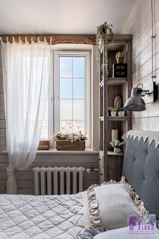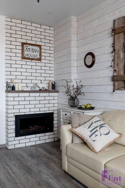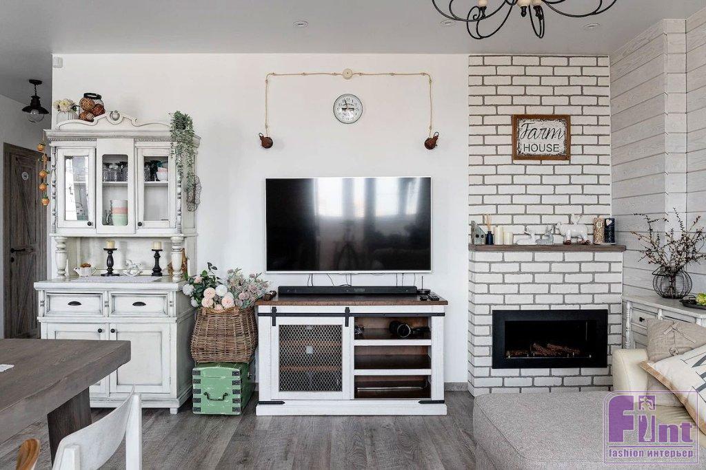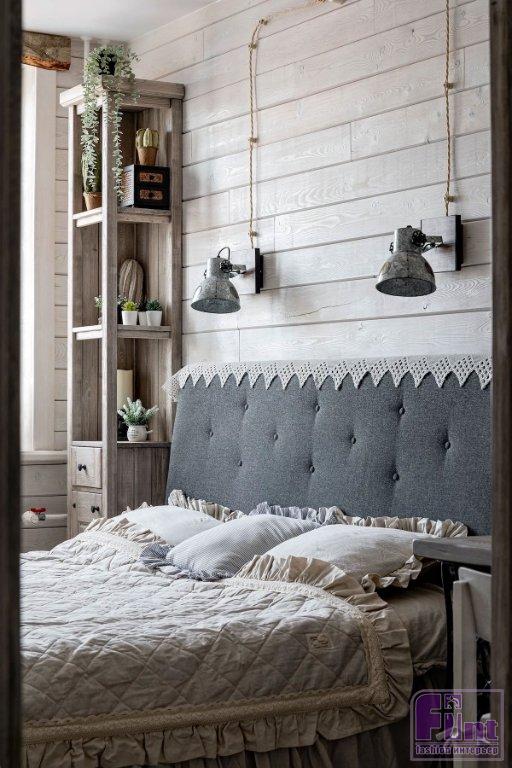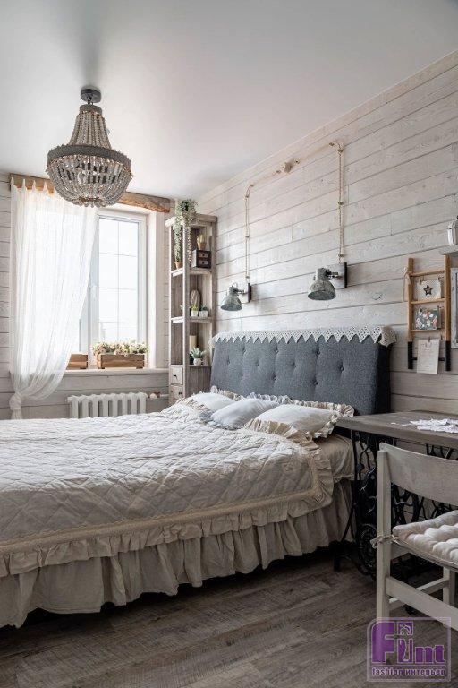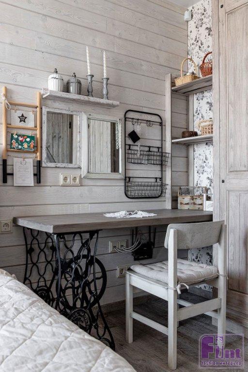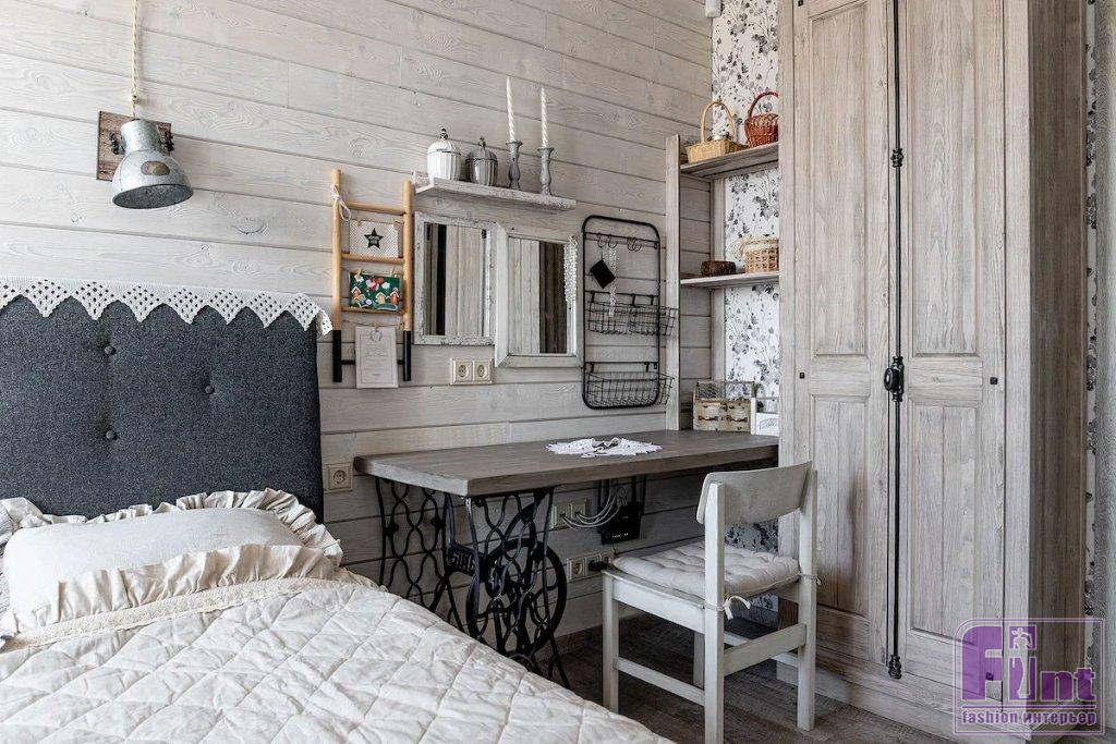 В гостиной своё место занял большой мягкий диван с банкеткой, дизайнер подобрала и отправила на реставрацию винтажные буфет и комод, которые стали практически стилеобразующими элементами этой зоны. В углу установлен биокамин (какой же дом без камина?) в портале с имитацией кирпичной кладки. Для спальни изготовили шкаф и этажерки из массива дерева. Мягкое изголовье кровати накрыто кружевной «гирляндой», что поддерживает выбранный стиль. Хозяйка занимается рукоделием, поэтому для неё в спальне обустроили хобби-зону. Стол изготовили из деревянной столешницы и подстолья от винтажной швейной машинки.
