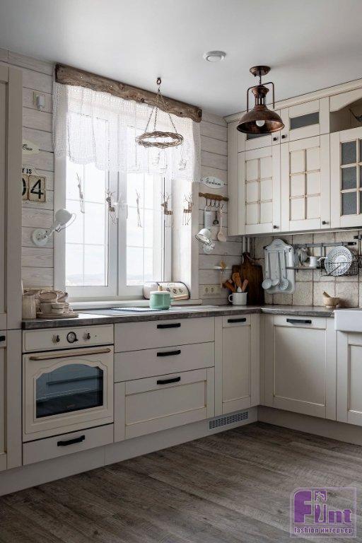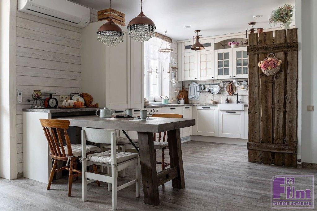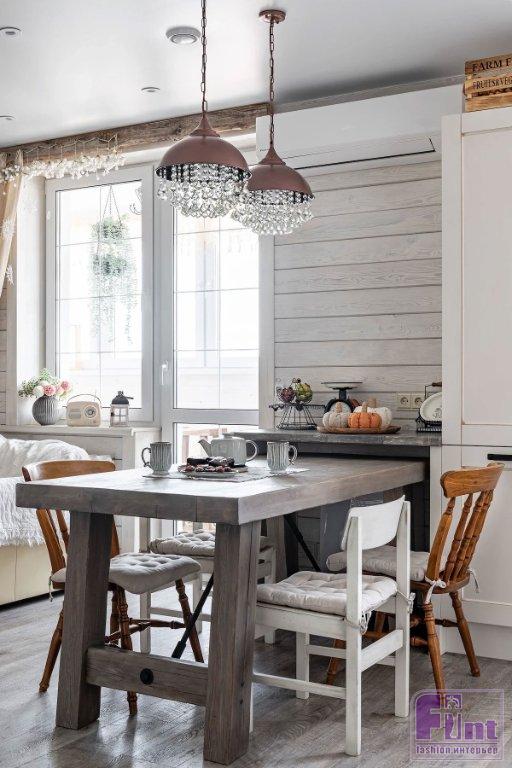 Мебель тоже отвечает выбранной концепции. Например, кухня. Хозяйка занимается кондитерством и продает полезные десерты. Поэтому ей была необходима функциональная кухня. Это и сделали, но, конечно же, не забыли об эстетике. Получилась угловая кухня с филёнчатыми фасадами с эффектом лёгкой состаренности, большой мойкой в фермерском стиле и духовым шкафом в ретроэстетике. Часть фасадов — из стекла, что очень сочетается с деревенской эстетикой. Кухня выглядит буквально «живой». Холодильник отдельно стоящий, и боковая панель декорирована панелью из состаренных досок. На кухне — большой обеденный стол, как будто грубо сколоченный, но на самом деле намеренно изготовленный таким на заказ из массива. Он, кстати, выдвигается при необходимости, а в остальное время может быть сложен. Стулья подобраны разных форм. За счёт этого получилось создать эффект расслабленности, лёгкой небрежности.