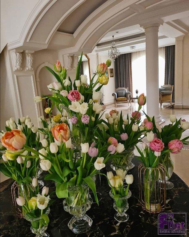 Дополняют обстановку классические гарнитуры в обивке из кожи, бархата и роскошного текстиля, внушительные многорожковые люстры из хрусталя и муранского стекла и иконы в массивных золотых окладах, которые можно заметить буквально в каждой комнате — тяжёлый люкс, как он есть! Одно из главных достоинств этого дома — огромные окна в пол, благодаря которым внутреннее пространство залито естественным солнечным светом. Хозяйка украсила окна тяжелыми портьерами в классическом стиле из дорогих, расшитых золотом тканей того же бежево-коричневого оттенка, что и весь интерьер.