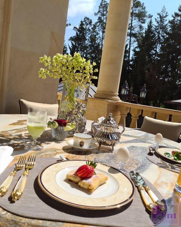 Много здесь и другого богатого декора: пышная лепнина, золотая резьба, подсвечники под старину, статуи, зеркальные вставки. Чего только стоит огромная зеркальная столешница в кабинете народного артиста РФ. Ну и конечно, интерьеры изобилуют классическими деталями — арками, колоннами, витражами, мраморными элементами. Мрамор здесь везде: на полу, стенах, лестницах и, конечно же, в предметах мебели. Помимо обеденного стола, это мраморные консоли, столики, мебель в ванных комнатах и т.д.