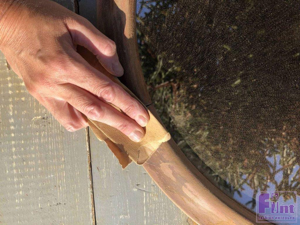 Начните со шлифовки рамы вашего зеркала. Это очень важно, так как она служит основой для клея, и старый лак с её поверхности лучше удалить, чтобы клей прочнее приклеил полоски джинсовой ткани.