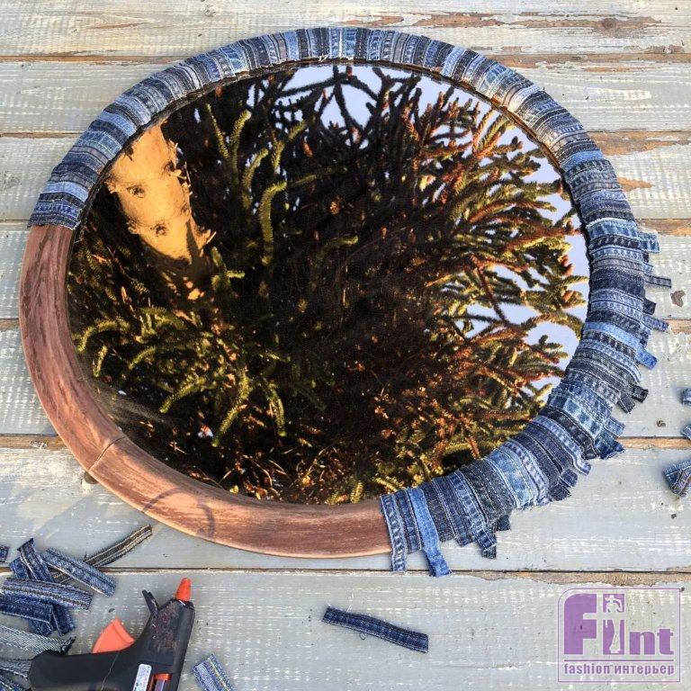 После того как вся рама будет оклеена полосками джинсовой ткани, обрежьте полоски по внешнему краю зеркала, при необходимости. Не переживайте, если края будут не совсем аккуратными, поскольку это придаст дополнительный шарм вашему зеркалу.