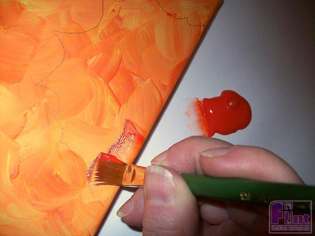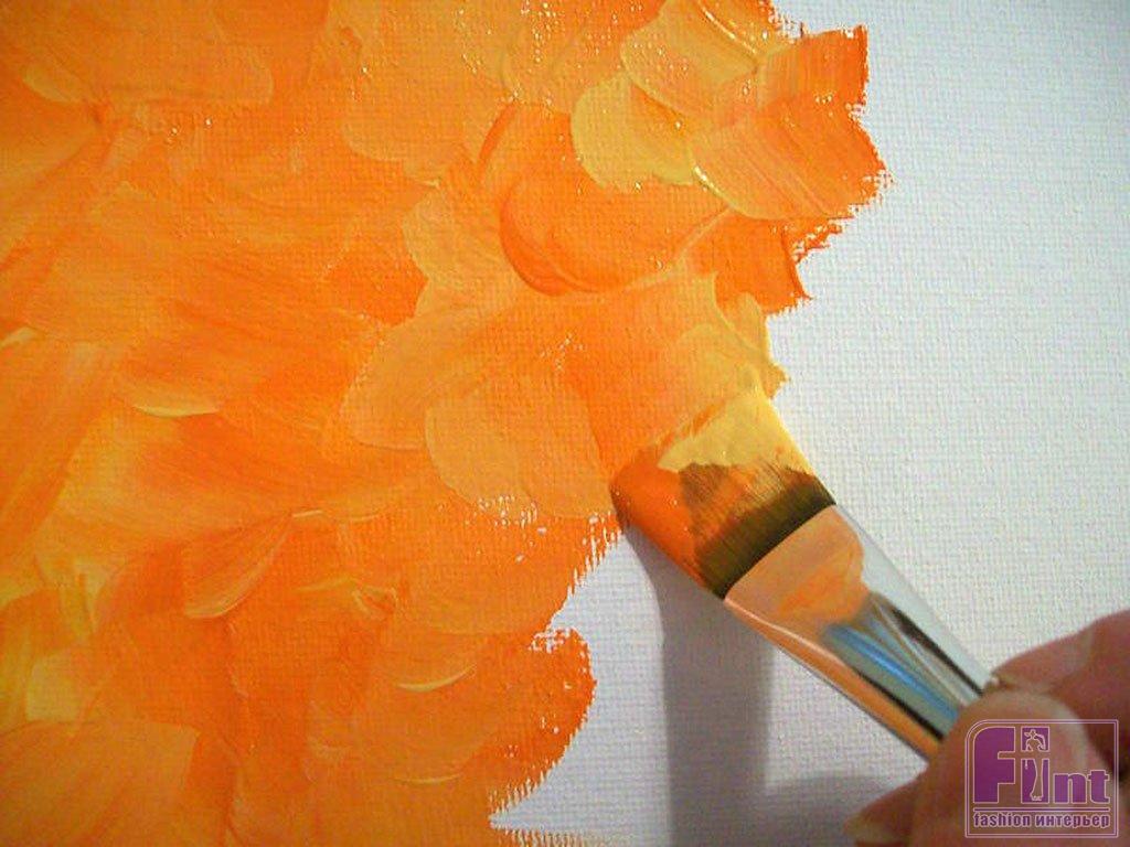 Приступаем к созданию фона. С помощью плоской кисти для рисования наложите на холст мазки оранжевого и жёлтого цвета. Для такого наложения цвета есть специальная техника, которая очень проста в исполнении. Обмакните кисть в два цвета одновременно, чтобы разные цвета находились на противоположных частях кисти. Это отлично видно на фото.