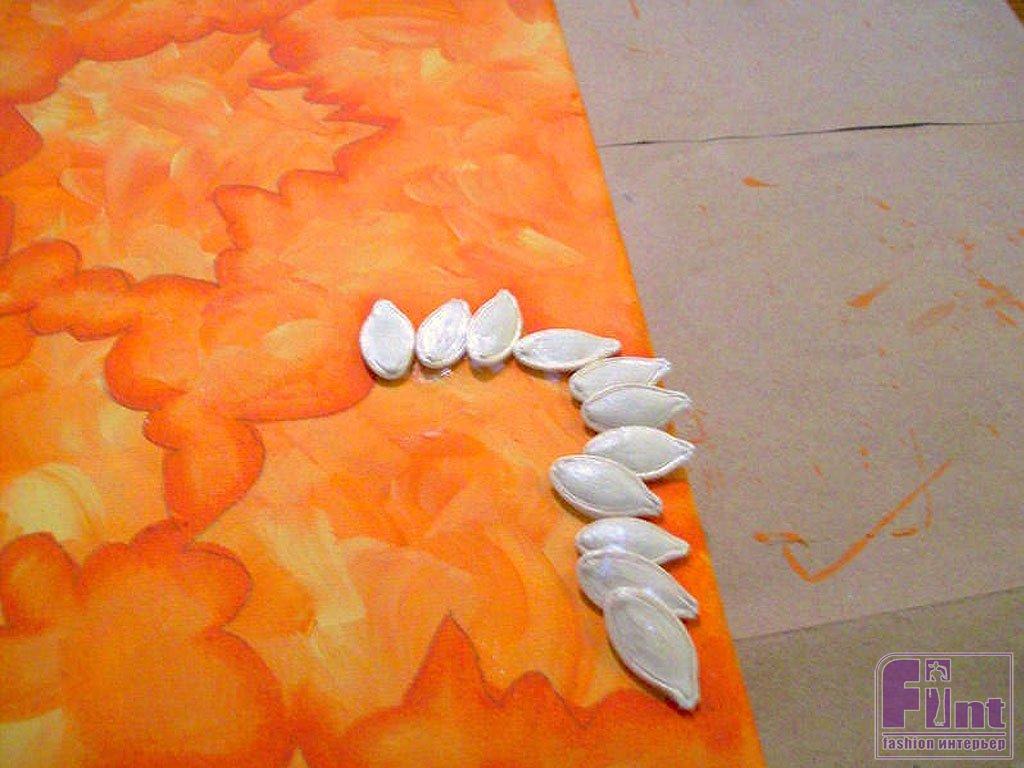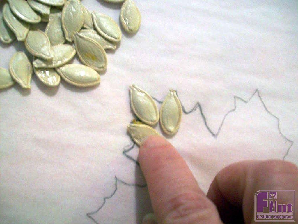 Тыквенные семечки являются излюбленным лакомством для многих людей. Их можно купить в готовом сушёном виде, или использовать семечки, оставшиеся после приготовления блюд из тыквы на вашей кухне. Тыквенные семечки имеют красивую форму, благодаря чему из них можно сложить прекрасное панно, придав семечкам форму листьев. Этот проект очень прост в реализации, и даже если у вас нет навыков в рисовании, мы научим вас технике необычного раскрашивания фона для панно.