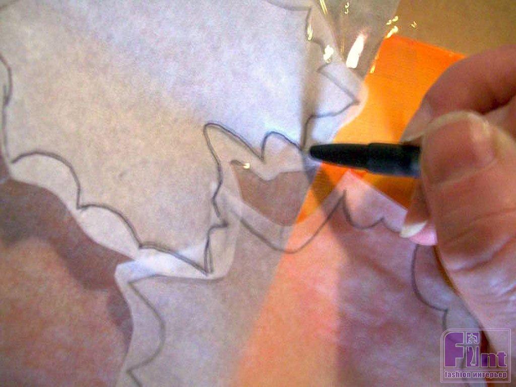 Затем, используя копировальную бумагу, перенесите получившийся декор из листьев на холст. После того как контуры листьев будут перенесены на холст, их можно немного украсить, сделав окантовку листьев по внешней линии. Набирайте немного более тёмной оранжевой краски на плоскую кисть и короткими мазками обработайте все контуры листьев, проводя кистью строго от контура листа в противоположную сторону, наружу. Сделайте такое «обрамление» для всех листьев на вашем холсте и дайте краске полностью высохнуть.