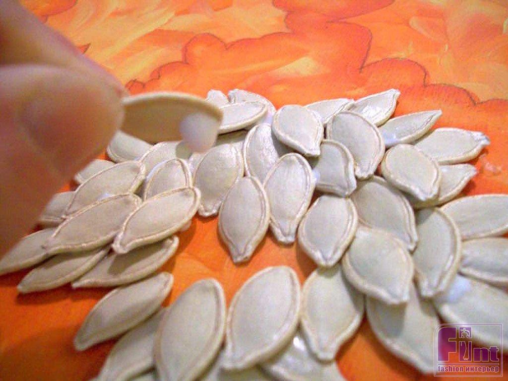 Прежде чем приступить к изготовлению панно, вымойте и обсушите тыквенные семечки. Если у вас нет семечек от тыквы, их можно купить в любом продуктовом магазине за весьма символическую цену.