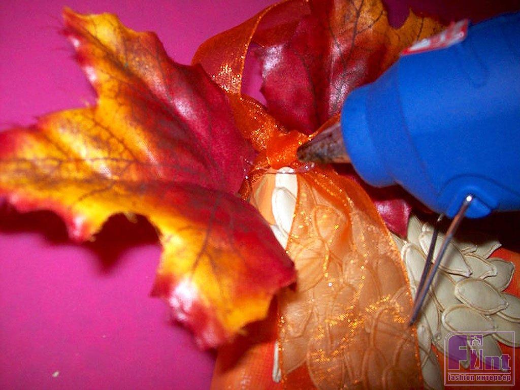В качестве завершающего штриха украсьте уголок панно искусственными кленовыми листьями, ленточкой в тон к ним и другими аксессуарами, подходящими к теме панно.
