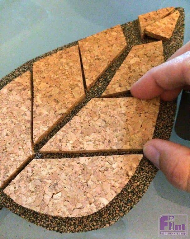 Горячим клеем приклейте каждый кусочек более светлой пробки, соблюдая равные отступы между фрагментами листа. Для хорошего закрепления кусочков светлой пробки вам потребуется всего несколько капель горячего клея. Готово!