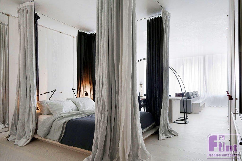 Отгородите кровать от остального пространства плотным пологом или шторой, которая сыграет роль перегородки. Вовсе не обязательно иметь кровать с каркасом для балдахина – достаточно прикрепить к потолку карнизы и повесить шторы на них. Хорошим спасением от холода станут и мягкие панели в изголовье кровати: ими можно оформить только зону у кровати или всю стену.